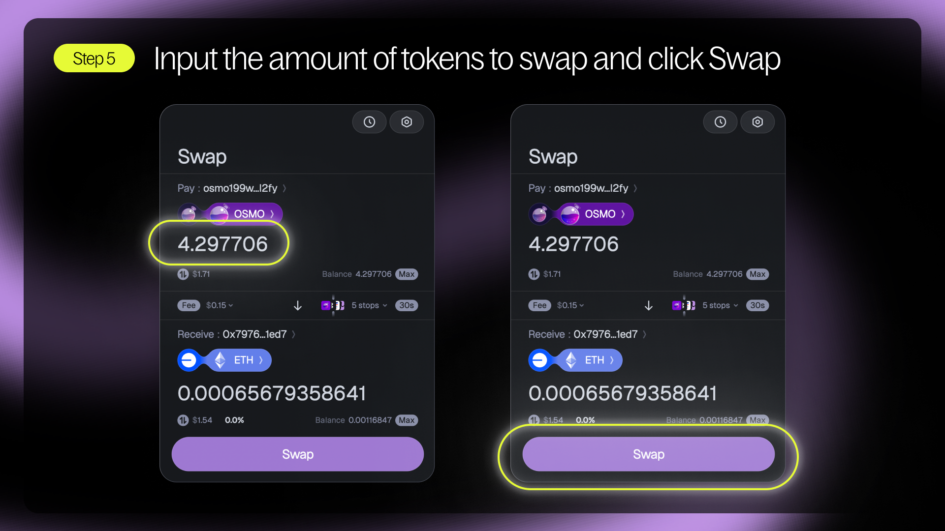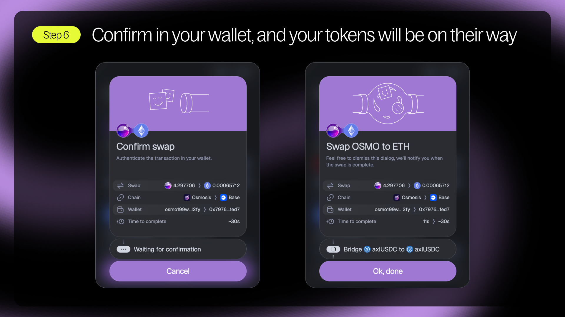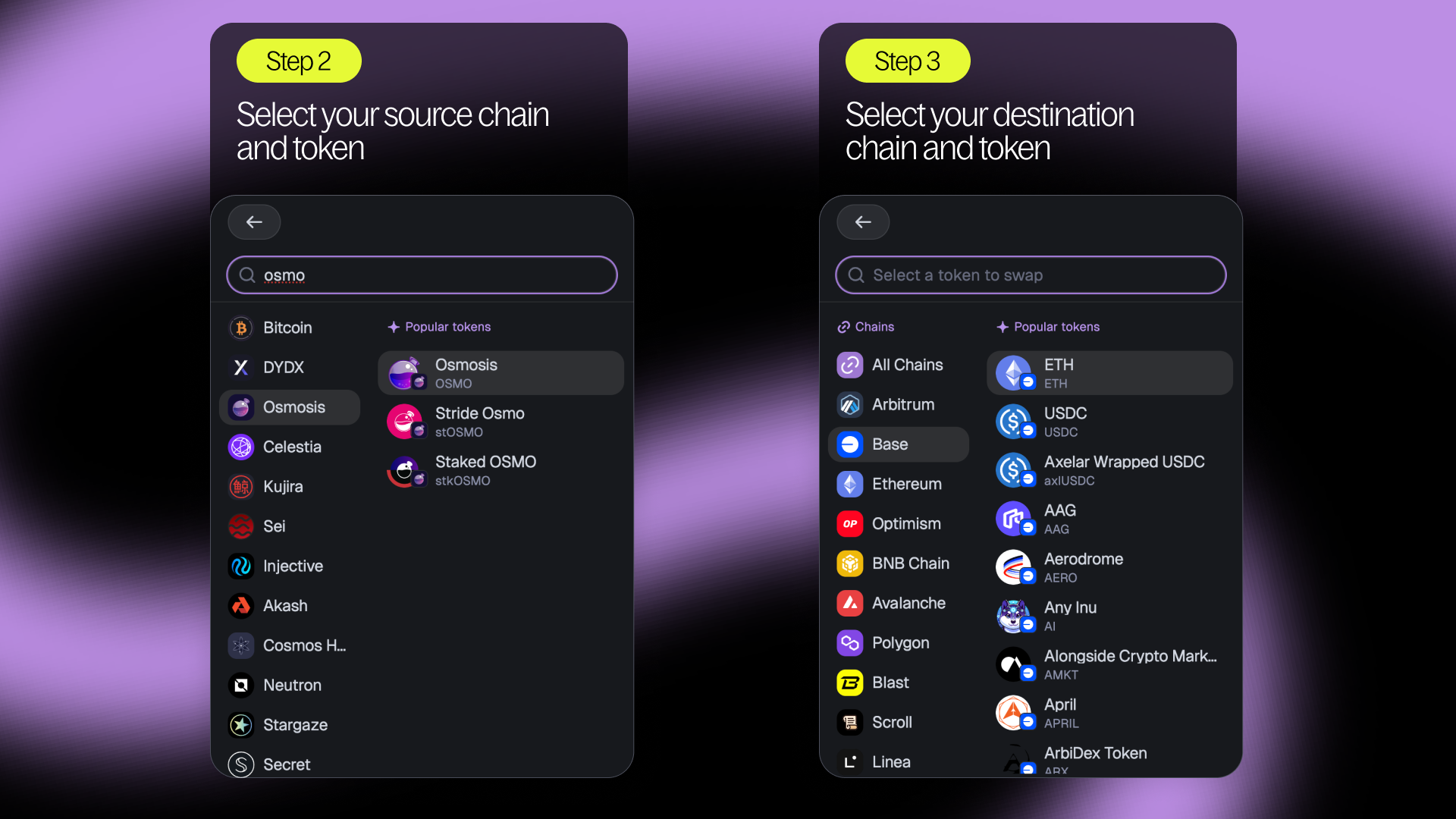 For the below example, we’ll be swapping OSMO on Osmosis to ETH on Base. In other words, we’ll use OSMO on Osmosis to get ETH on Base. It’s bridging and swapping all in one easy step.
