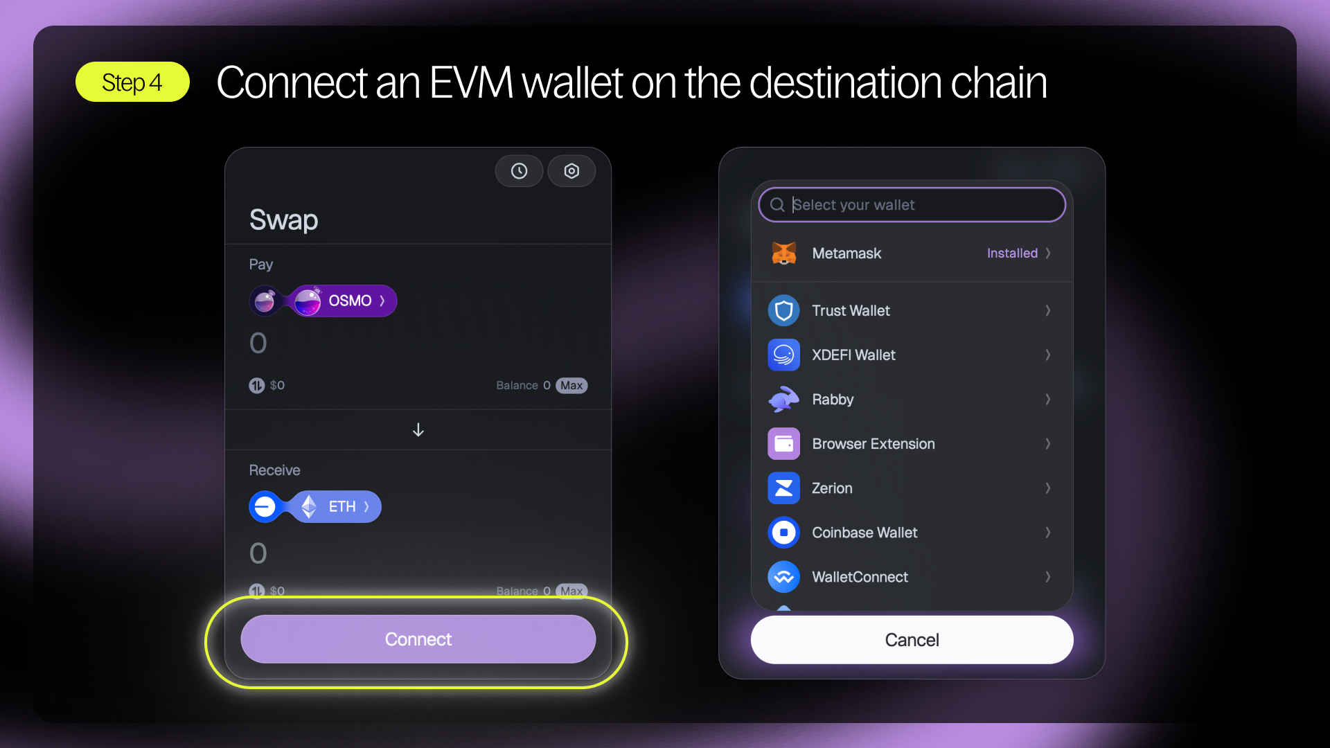 Step 4 - Next, add your address on the destination chain, either by connecting a compatible wallet, or pasting the address.