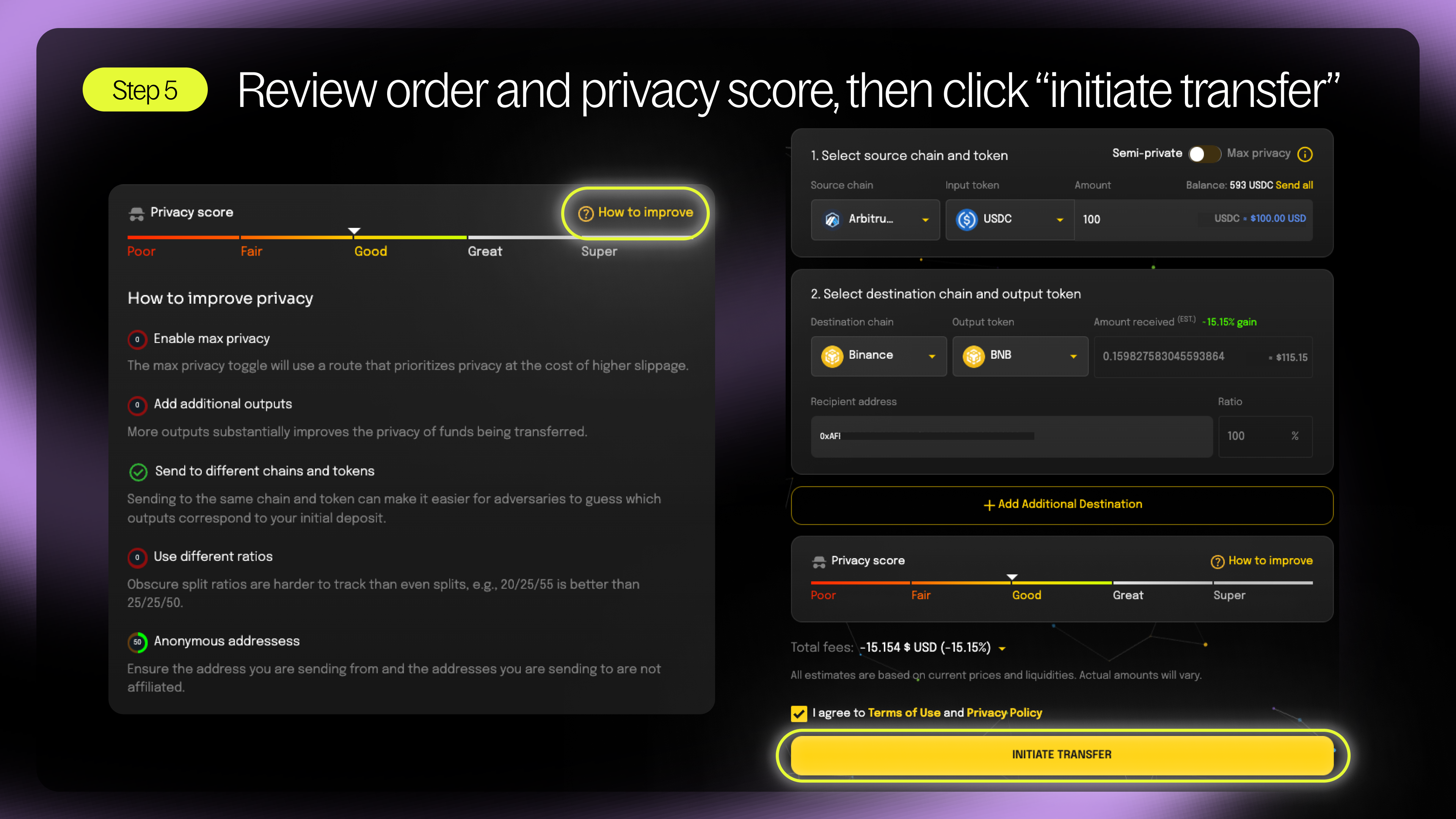 Step 5 - Review your privacy score and click “how to improve” for suggestions on how to enhance it. Once you’ve reviewed your order, click “execute swap” to submit your silent swap. Monitor your transaction in real-time and receive tokens in 5-20 minutes.