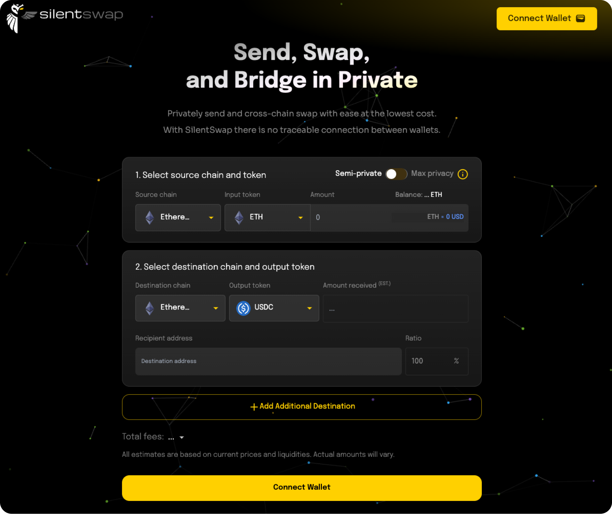 SilentSwap enables users to send and swap crypto in a private and non-custodial way. Squid powers cross-chain capabilities on SilentSwap so that users can silently swap any token across any supported chain. We’ve created a step-by-step guide for how to swap on SilentSwap.