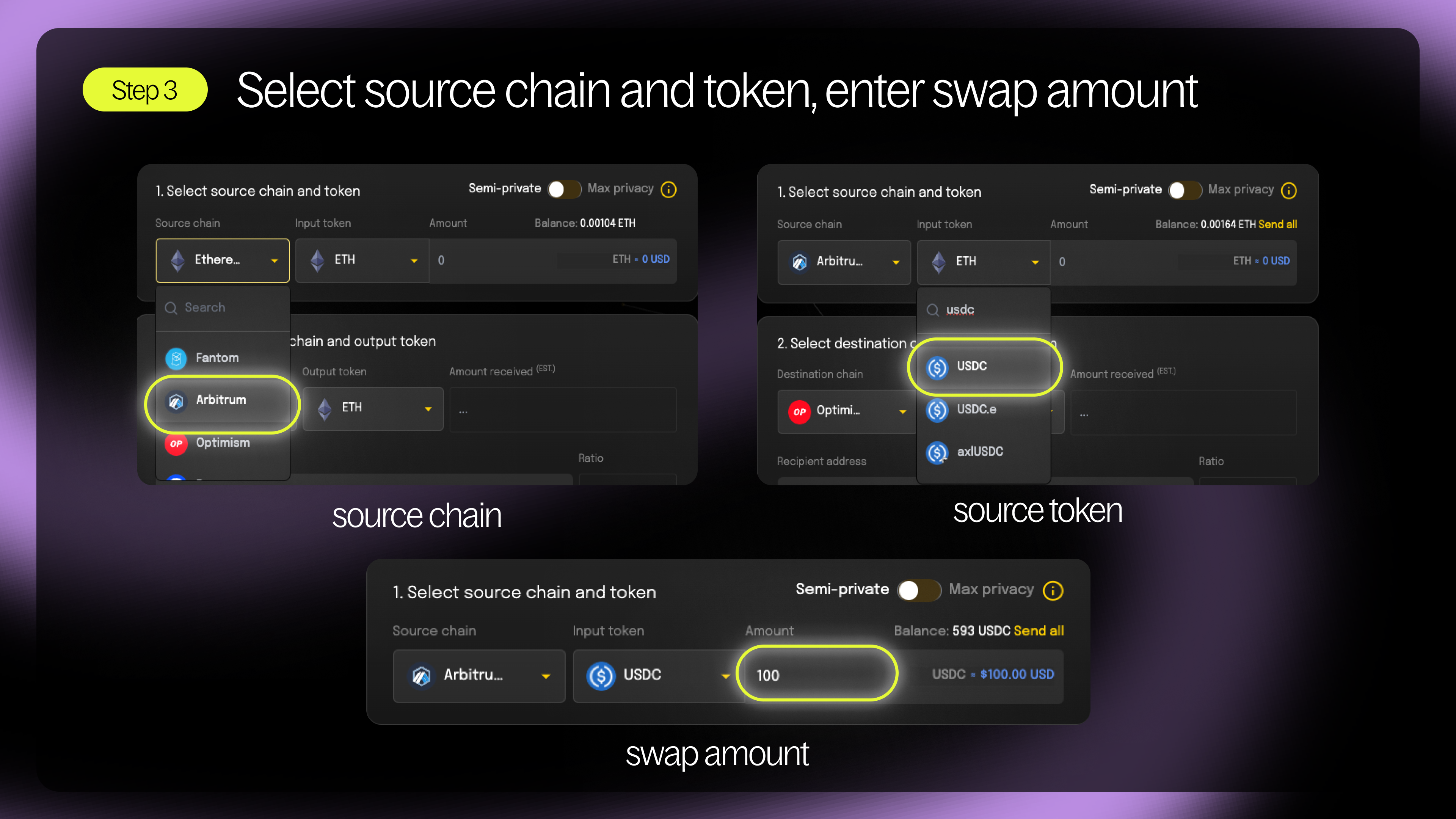 Step 3 - Select your source chain and token and enter the amount of source token you’ll be swapping.