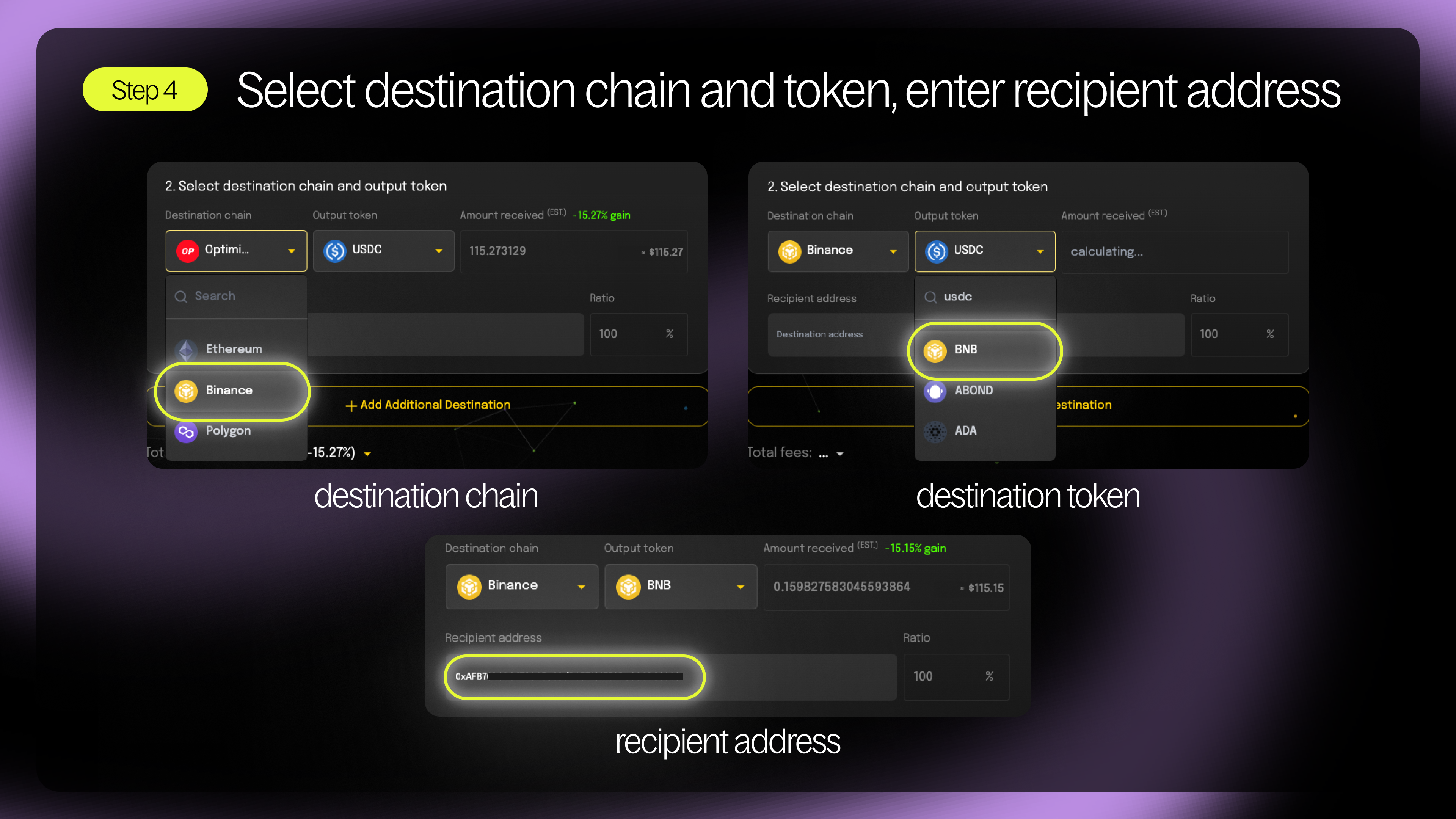 Step 4 - Select your destination chain and token and enter the recipient address that will receive destination tokens.
