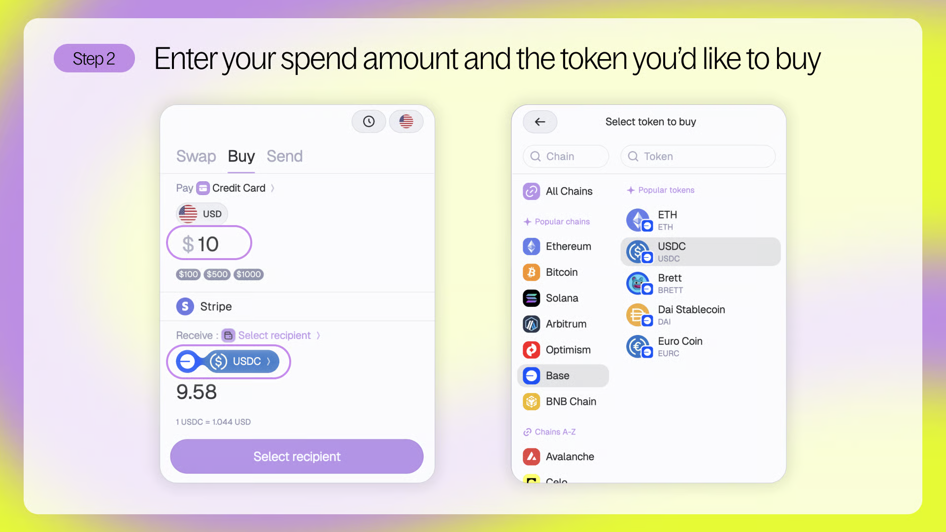 Step 2 - Enter the amount of the intended purchase and select the token you’d like to receive (along with the chain you’ll be receiving this token on). Click “Checkout” to continue. For this example, we’ll be purchasing $10 of USDC on Base.