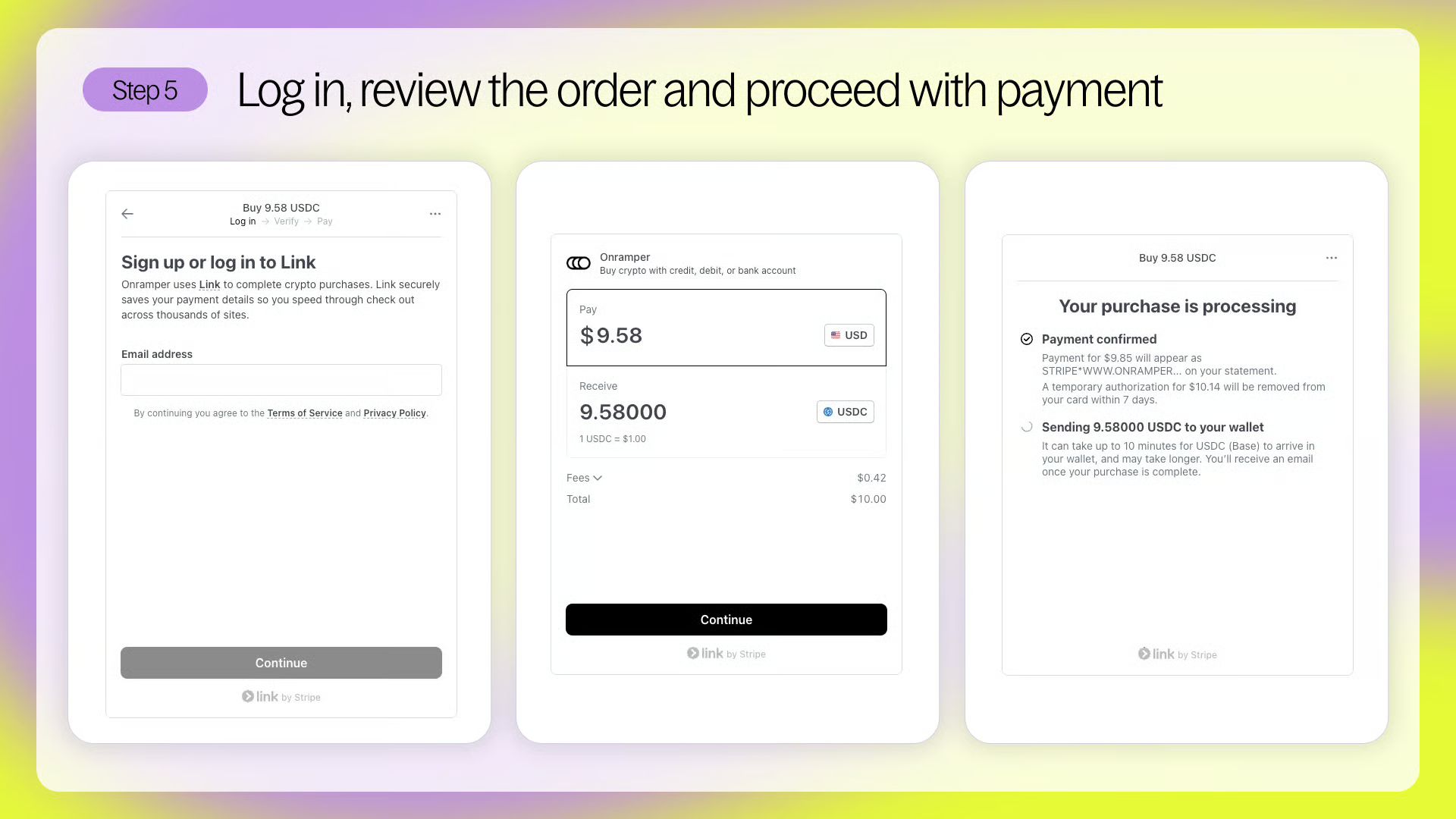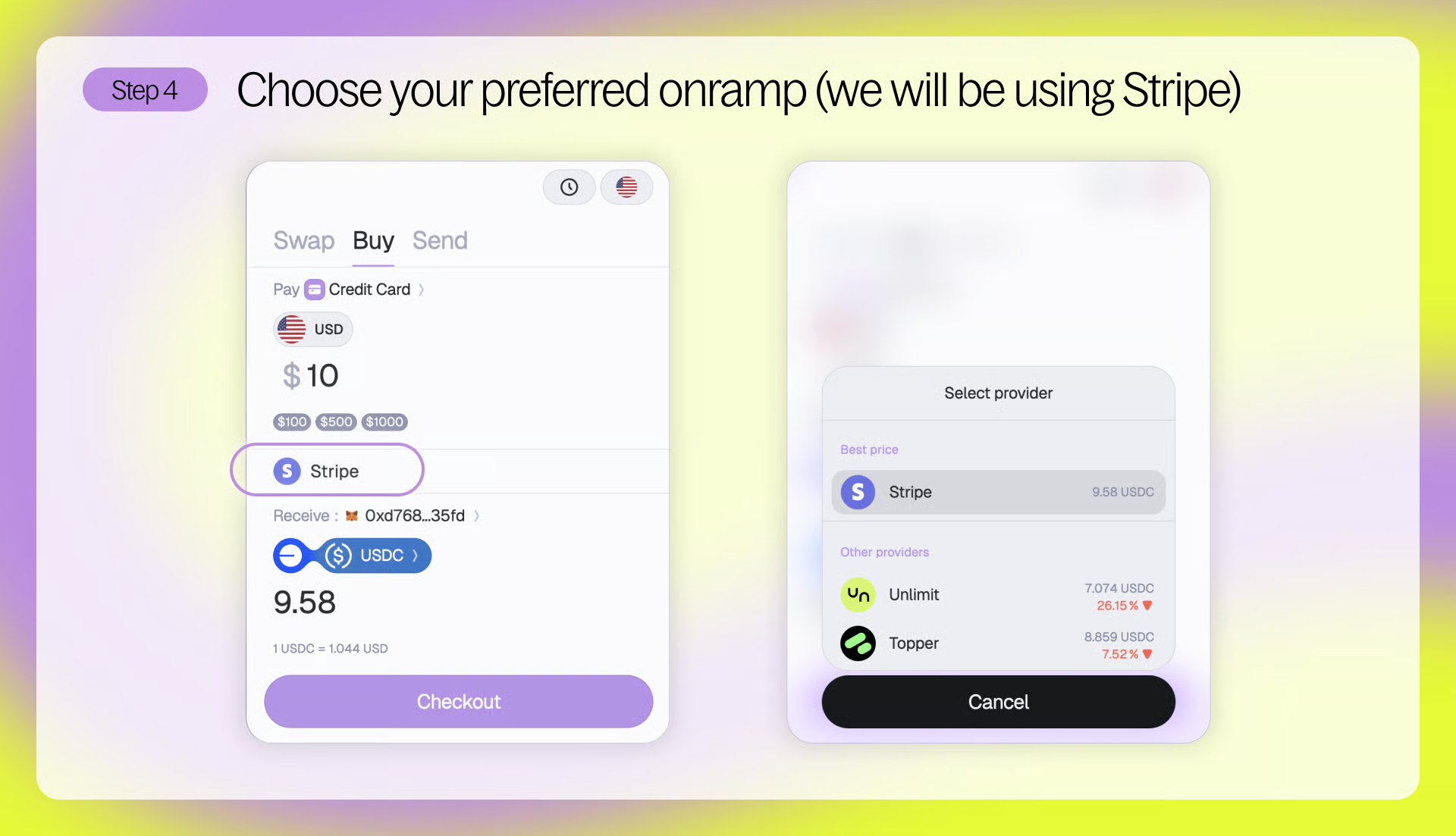 Step 4 - Choose your preferred onramp provider - we’ll be using Stripe to checkout. If you do not have an existing account, you will need to create one, submit personal information, and verify through an email address.