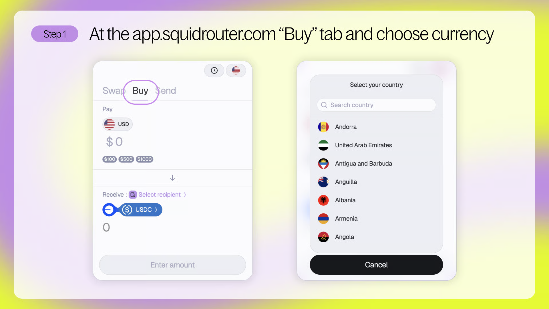 Step 1 - Visit app.squidrouter.com and click the “Buy” tab. Select the currency you’d like to purchase crypto with.
