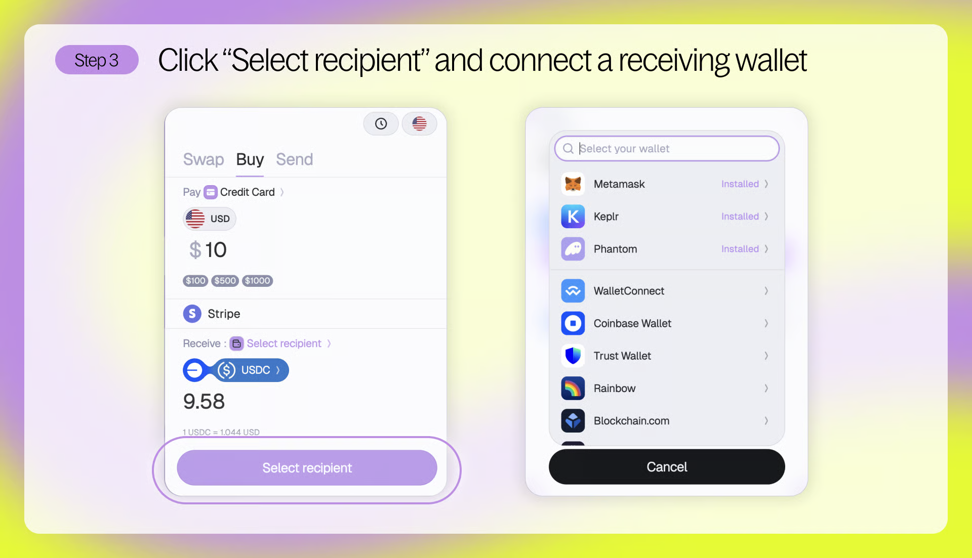 Step 3 - Click “Select recipient” and connect the wallet where you would like to receive the tokens.