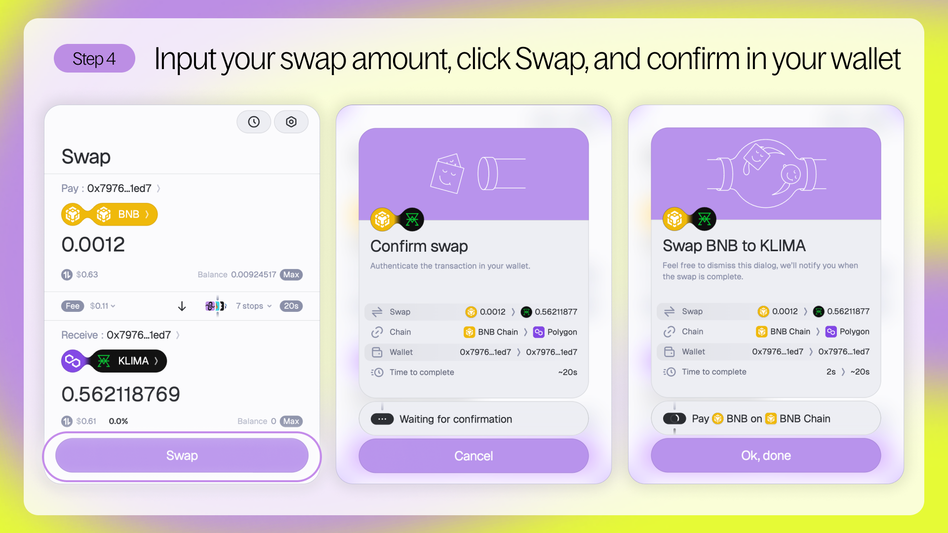 Step 4 - Enter the amount of BNB that you would like to swap into $KLIMA on Polygon. Review your order and click ‘Submit.’ Make sure to approve in your wallet too, if prompted. You will see a ‘Processing’ message followed by ‘Complete.’ Congratulations, you now have $KLIMA on Polygon!