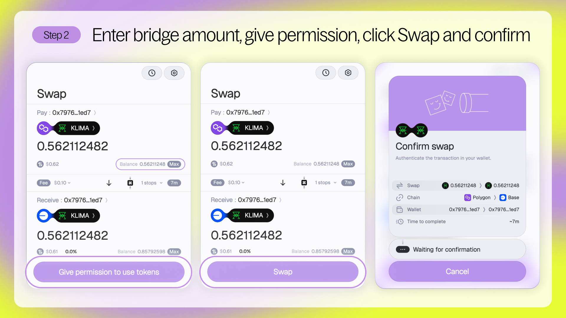 Step 2 - For this example, we’ll be sending $KLIMA from Polygon to Base. Be sure to give permission and confirm in wallet if prompted.