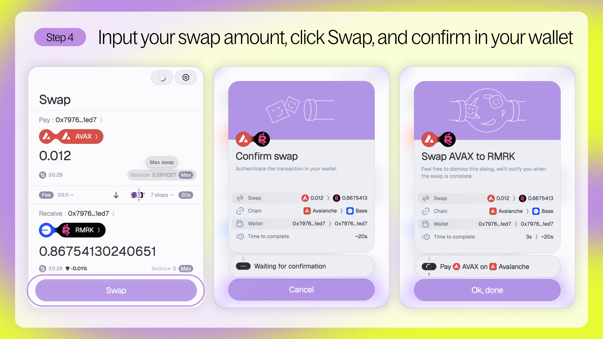 Step 4 - Enter the amount of BNB that you would like to swap into $RMRK on Base. Review your order and click ‘Submit.’ Make sure to approve in your wallet too, if prompted. You will see a ‘Processing’ message followed by ‘Complete.’ Congratulations, you now have $RMRK on Base!