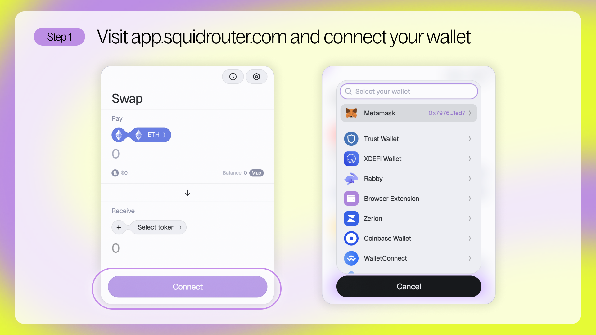 Step 1 - Visit v2.app.squidrouter.com and connect your wallet.