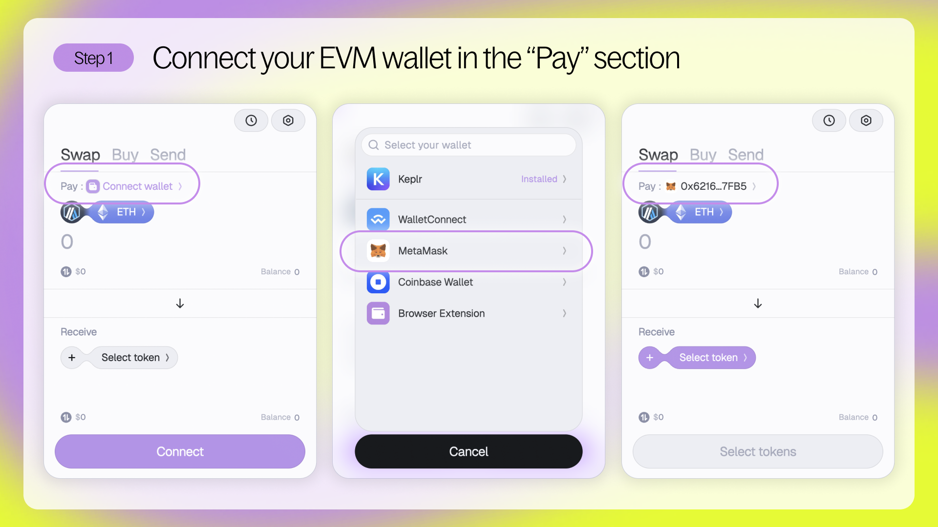 Head to app.squidrouter.com and click Connect Wallet. Choose MetaMask or your preferred EVM wallet, and approve the connection.