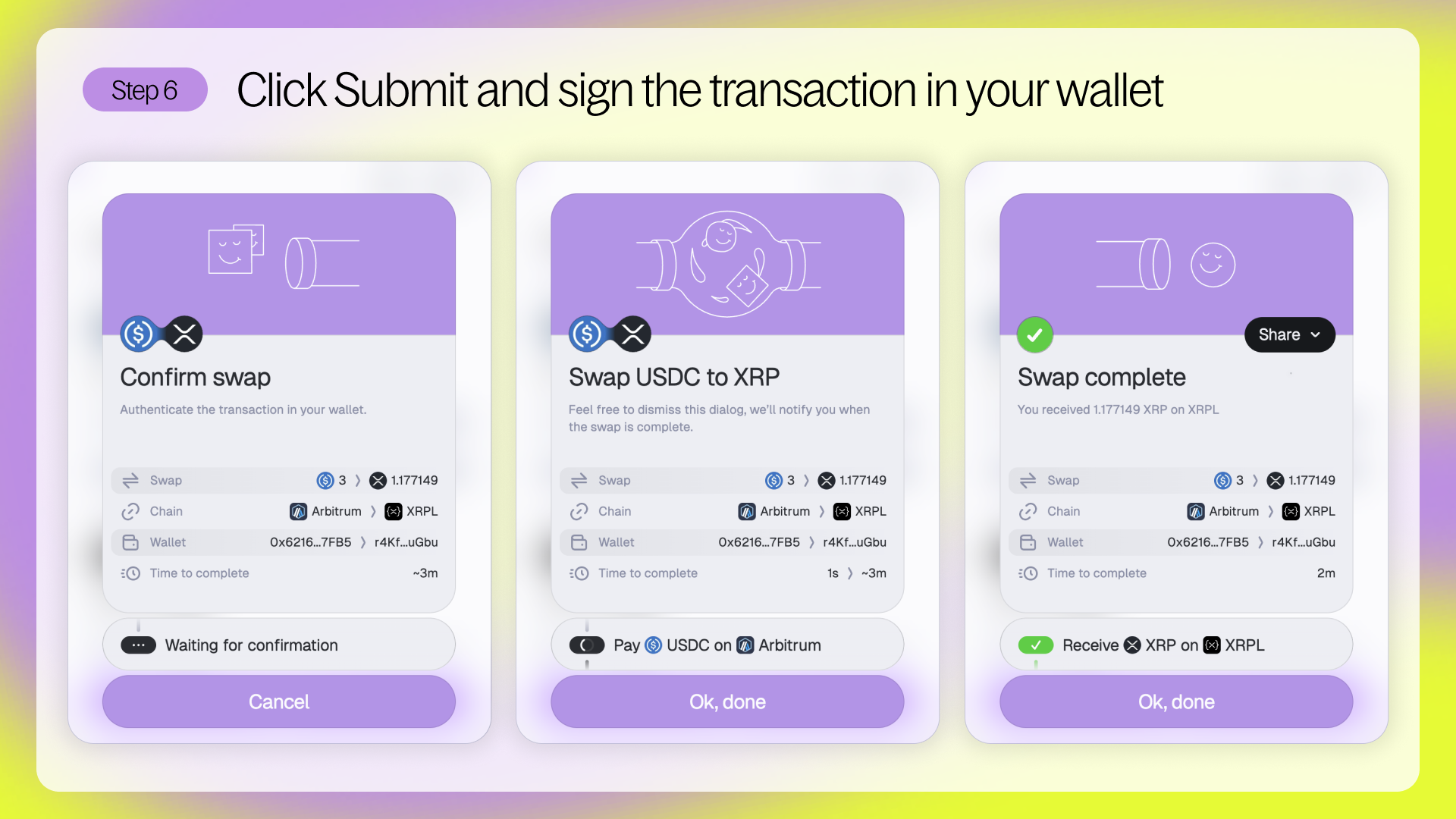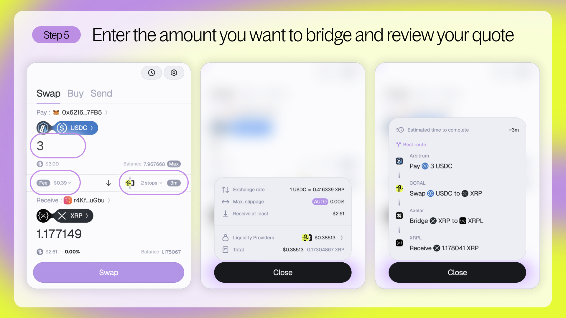 In this example, we’ll be exchanging USDC from Arbitrum to XRP on the XRP Ledger, but the steps are the same across all supported chains.