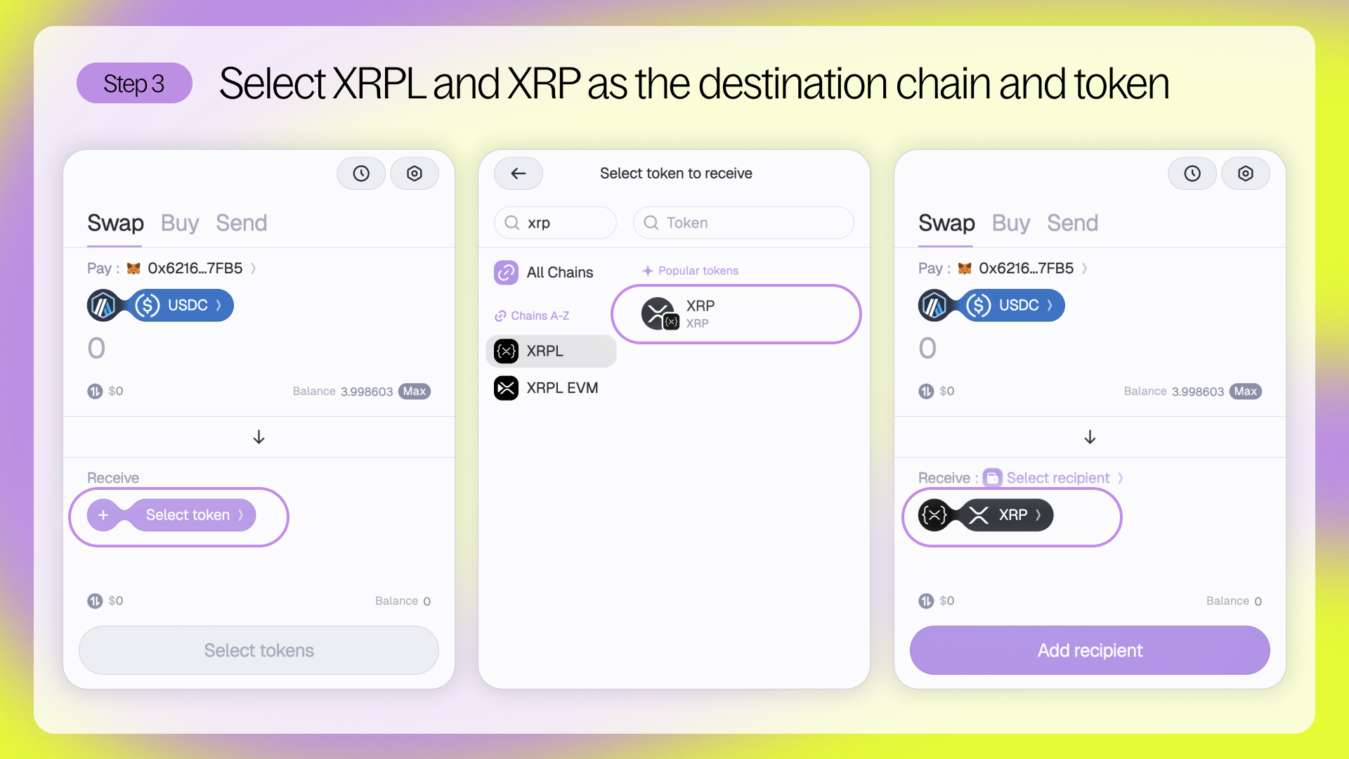 Under Receive, click the dropdown and choose XRPL as the chain and XRP as the token.