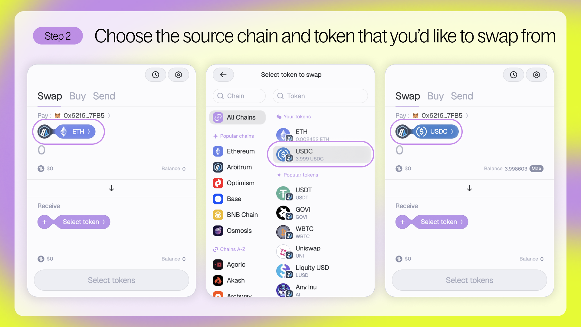 Click the dropdown under Pay to select the chain and token you want to swap from. For example, select Arbitrum and USDC.