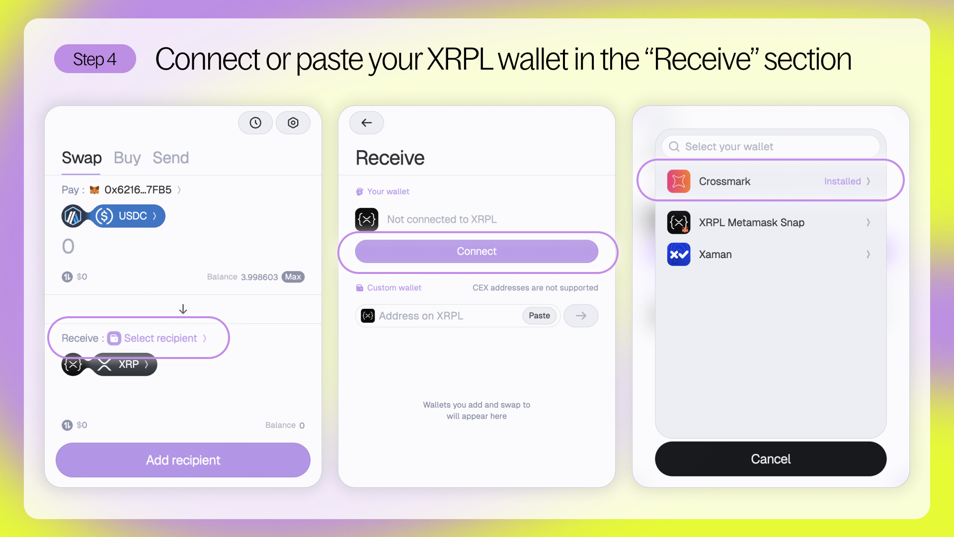 Click Select Recipient and either connect your XRPL wallet (e.g. Xaman or Crossmark) or paste your XRPL address directly.