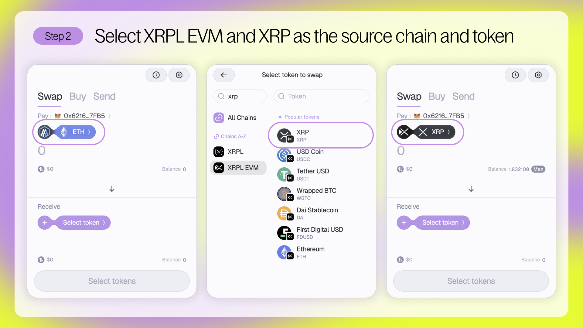 Step 2 – Select XRPL EVM and XRP as the source chain and token