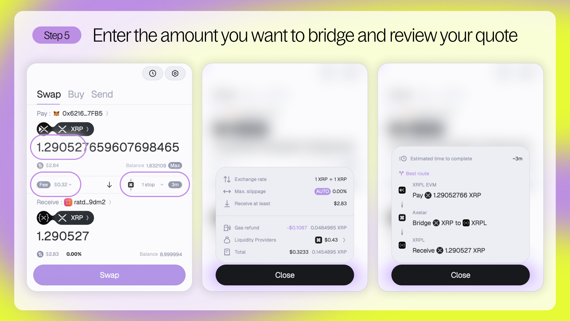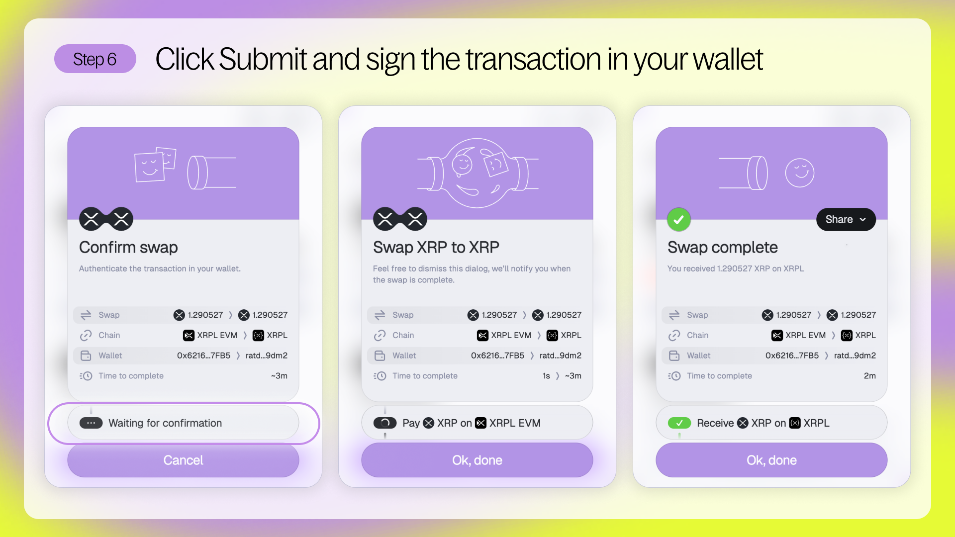 Click Swap, then follow the wallet prompt to confirm the transaction. Once confirmed, your XRP will be bridged and returned to your XRPL wallet within minutes.