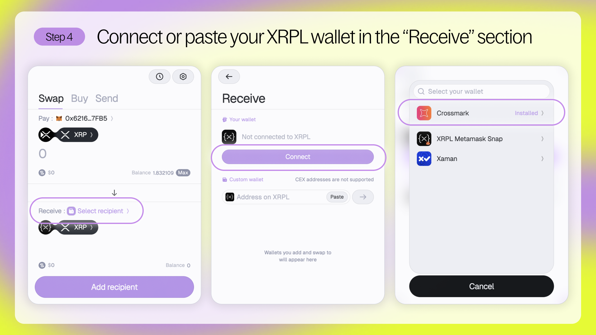 Click Select Recipient and either connect your XRPL wallet (e.g. Xaman or Crossmark) or paste your XRPL wallet address manually.