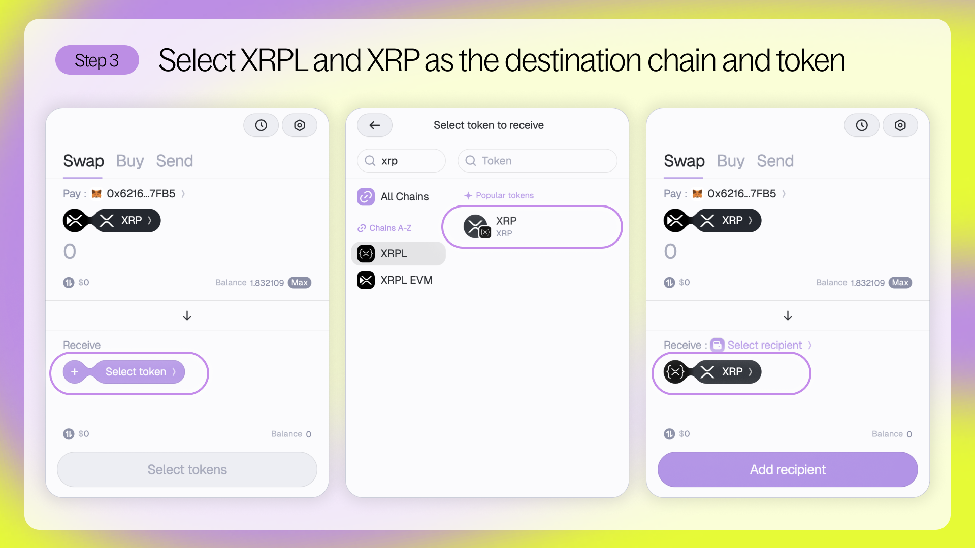 Under Receive, click the chain and token dropdown. Select XRPL as the destination chain and XRP as the token.