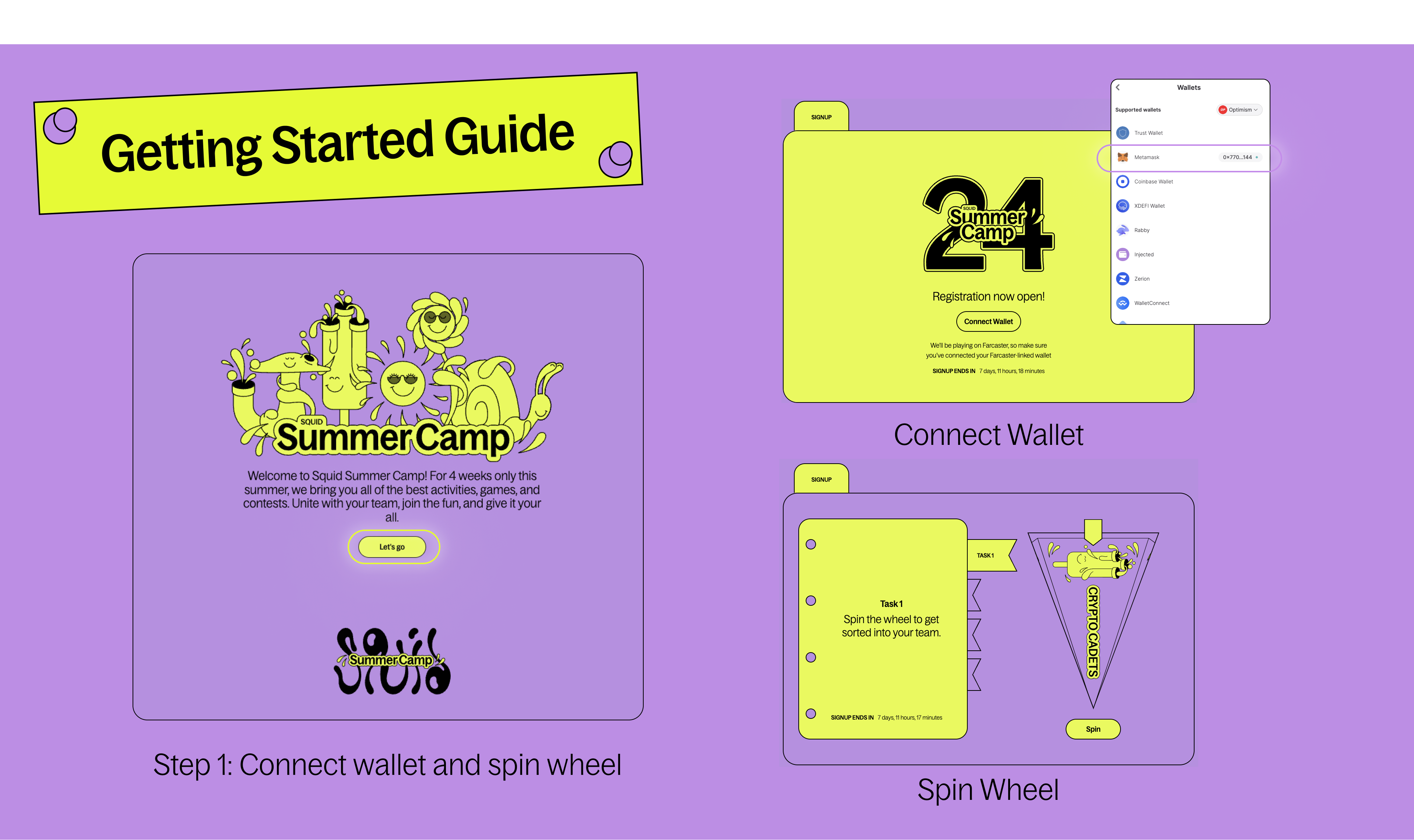 Step 1 - Visit summercamp.squidrouter.com and connect your wallet to spin the wheel and get sorted into your camp team. Tip: Make sure to use a wallet you have connected to Farcaster if you want to play along there too!