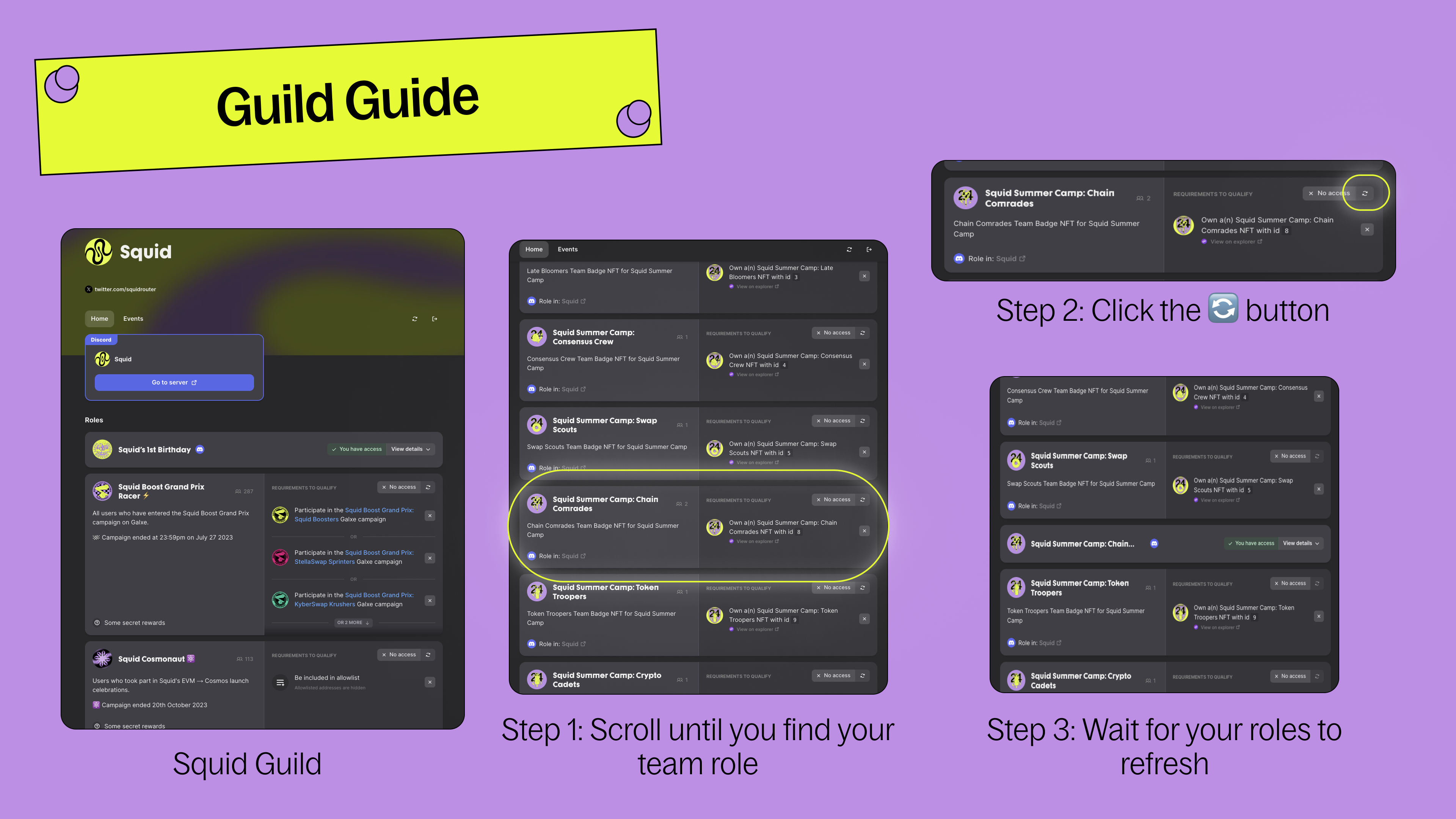 Guild Tip: Click the 🔄 button to refresh your roles on Guild. It may take a few minutes to verify your new role, so please be patient. You can click the 🔄 button at the top of the page, or on the individual tab. Unless you have qualified previously for any other Squid roles, you will only be able to claim the role of the team badge you have minted.