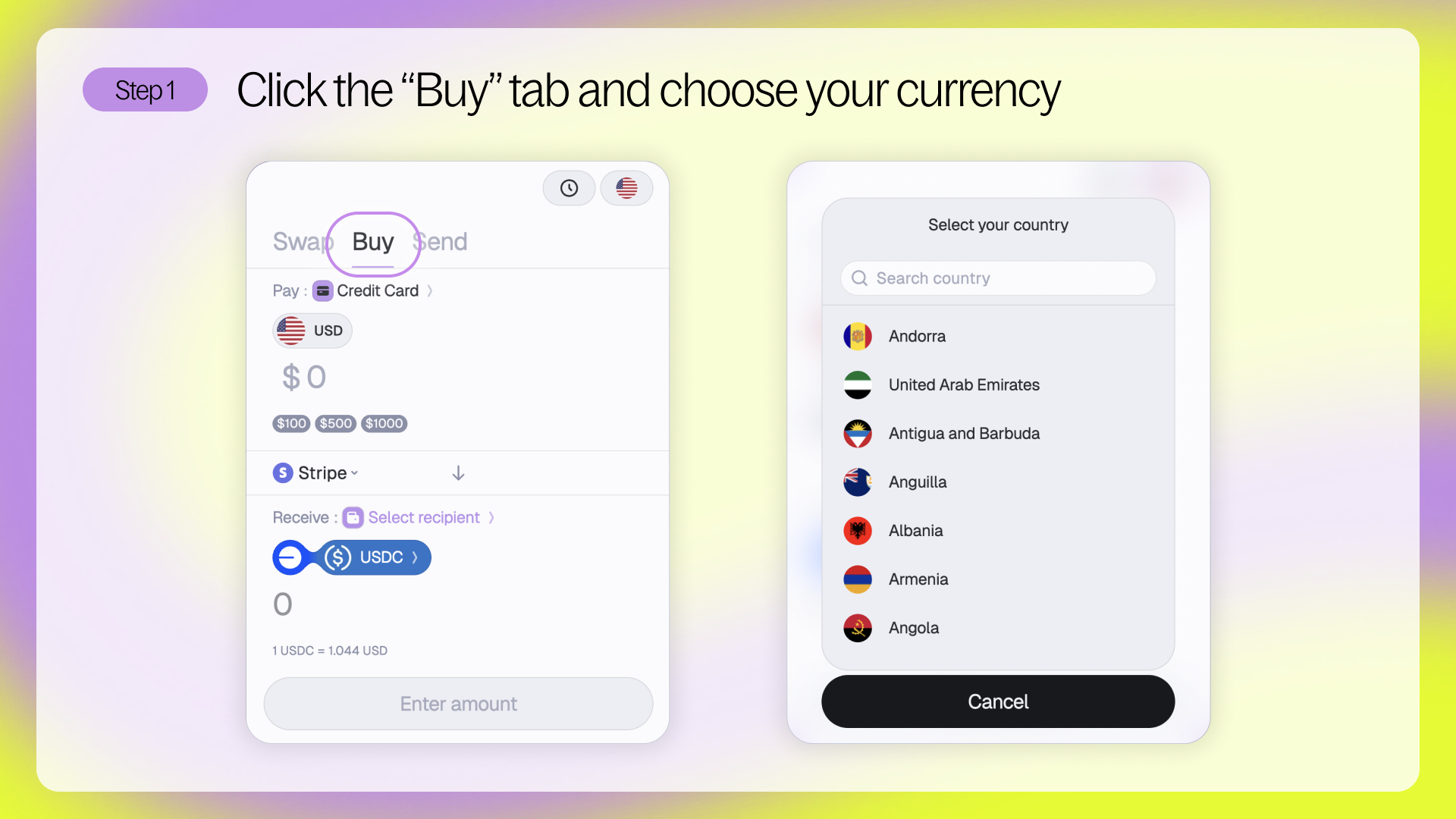 Visit app.squidrouter.com, click the Buy tab, choose your country and select the fiat currency you want to pay with.