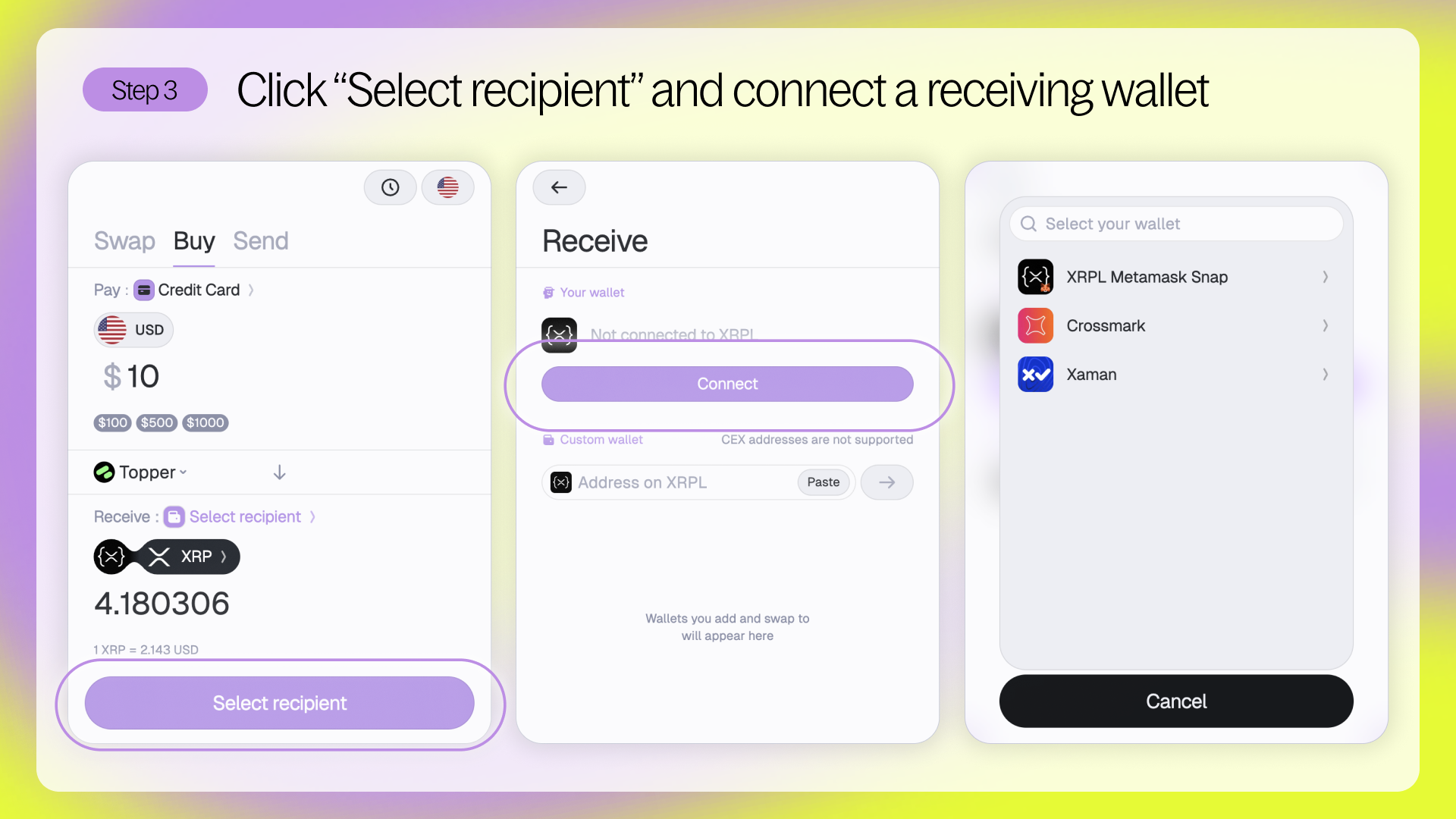 Click Select recipient, then connect or paste the XRPL wallet where you want the XRP delivered.