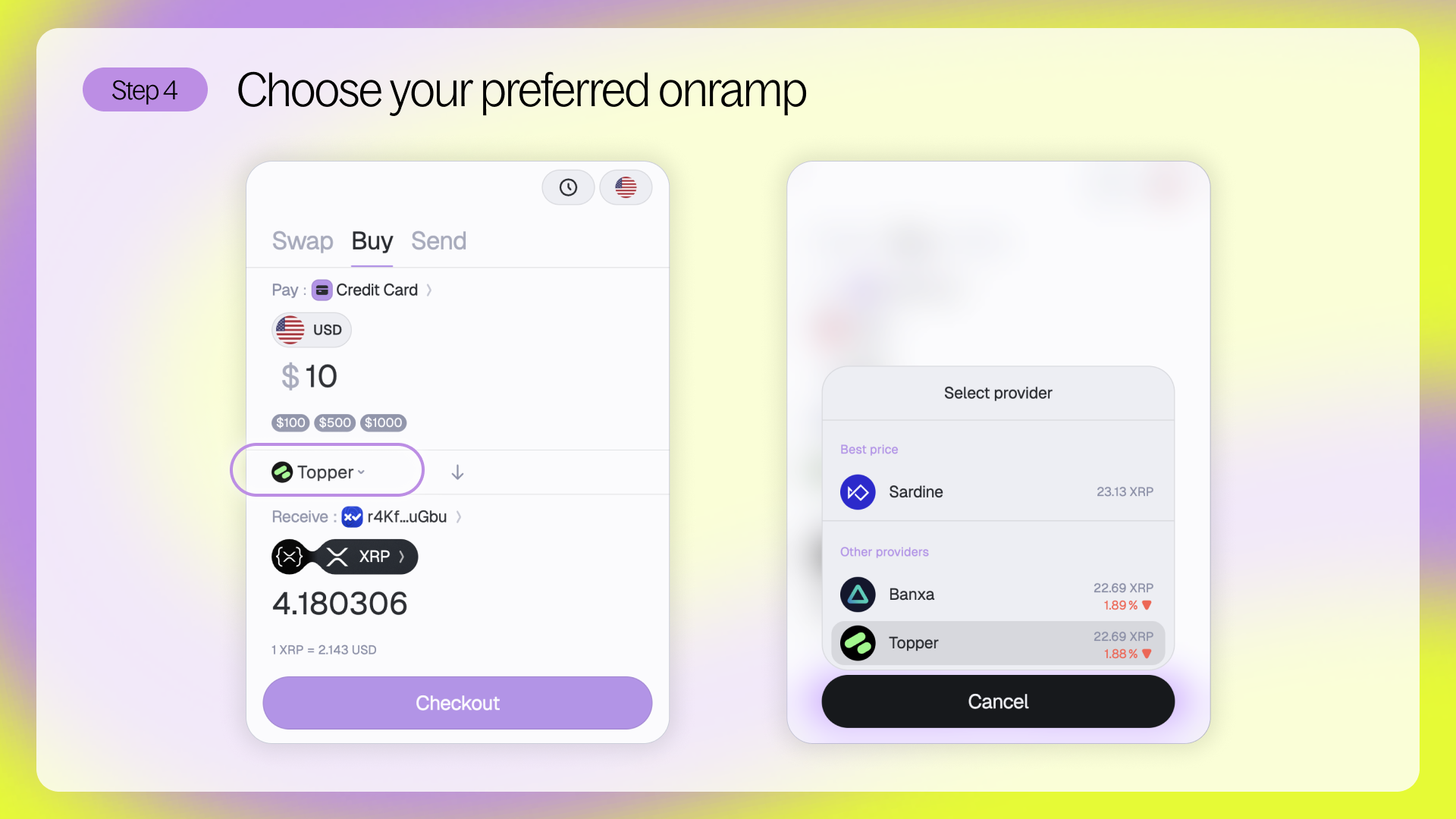 Need XRP fast? Whether you’re activating a brand new wallet, topping up for network fees, or simply stacking XRP to hold or spend in XRPL apps, Squid’s fiat on-ramp lets you purchase native XRP with a card (or other local payment rails) and send it straight to your address - no exchange account required.