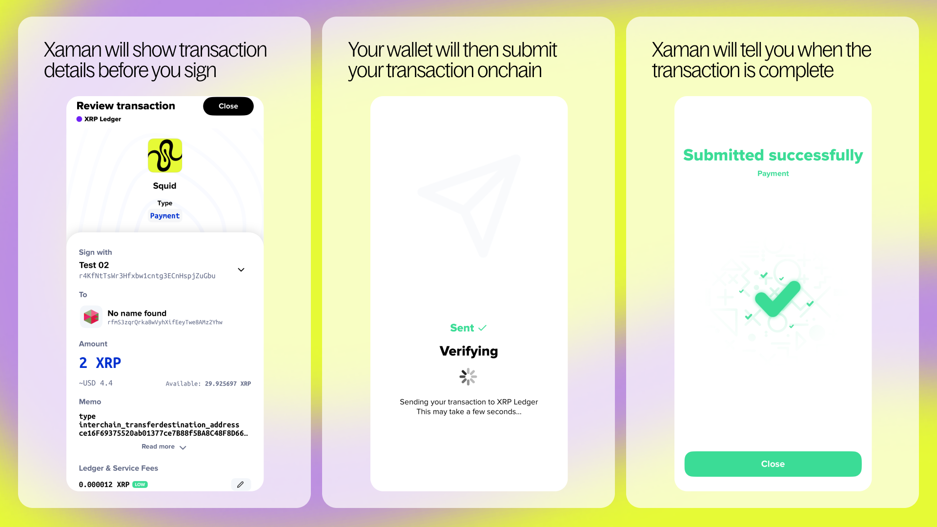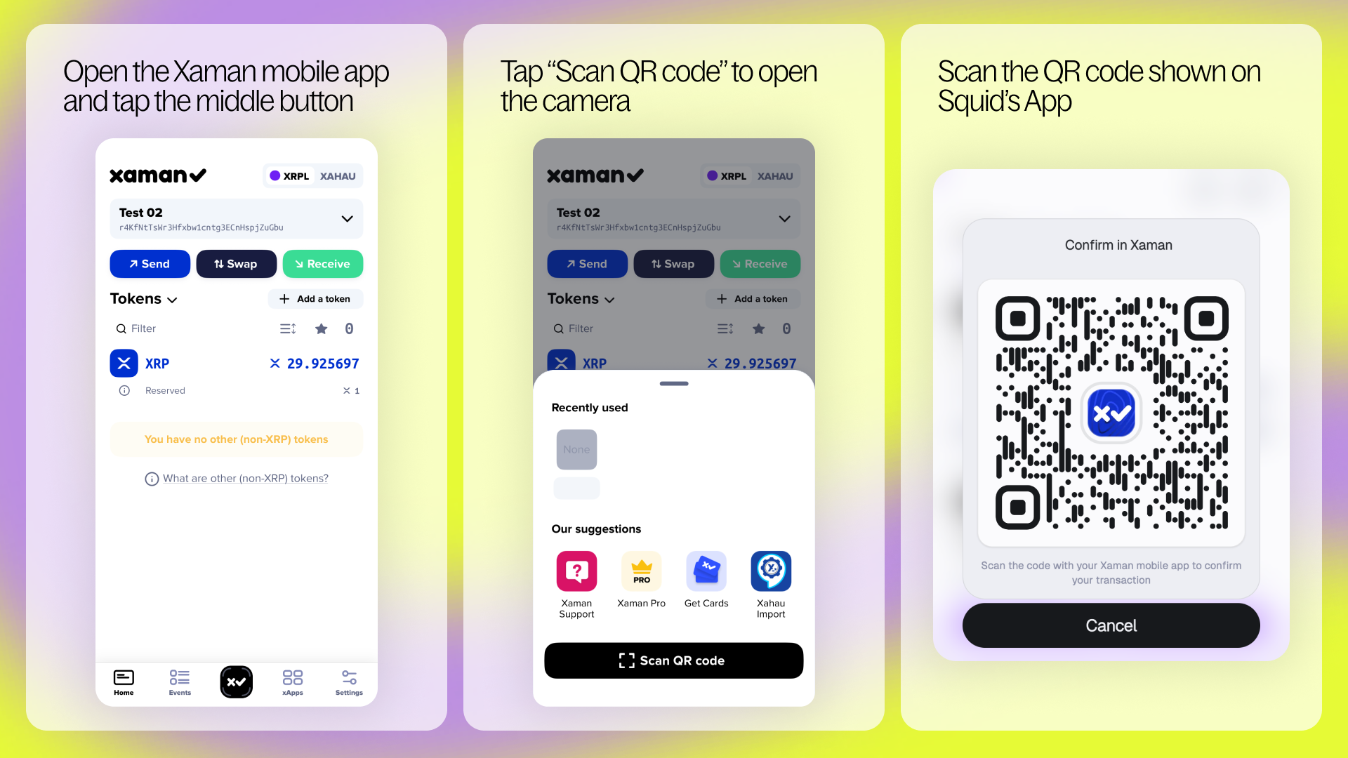 In this guide, we’ll walk through how to connect your wallet and sign transactions on Squid’s app using the Xaman mobile wallet. While screenshots and prompts here come from Xaman, the underlying steps apply across other XRPL wallets - so if you’re using Crossmark or another provider, you’ll recognise the same core principles even if the UI looks a little different.