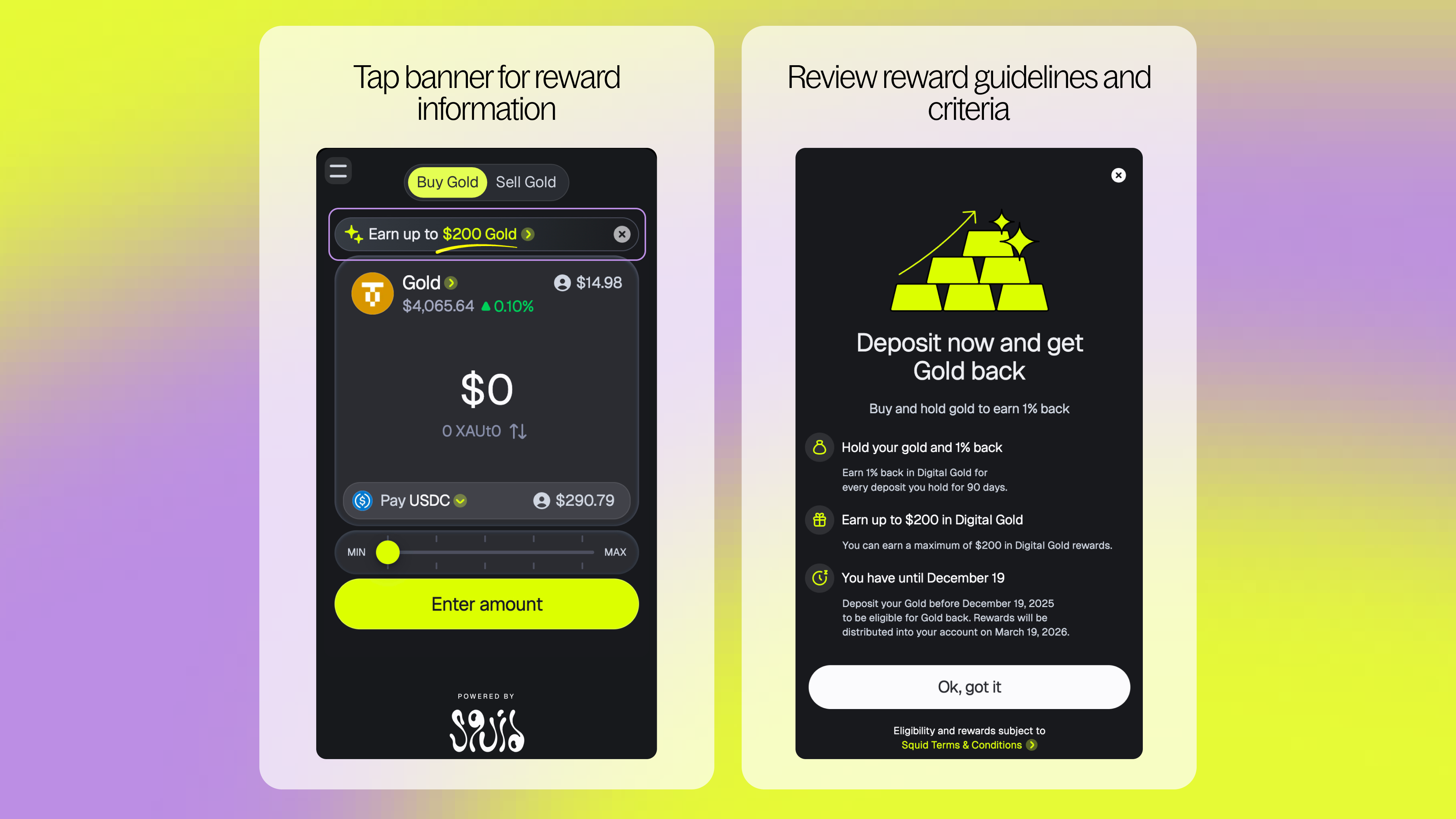Step 2 - Tap the “Earn up to $200 Gold” banner for specifics on rewards and eligibility criteria. Eligibility is subject to Squid’s Terms & Conditions. Please review them to ensure you are eligible for rewards.