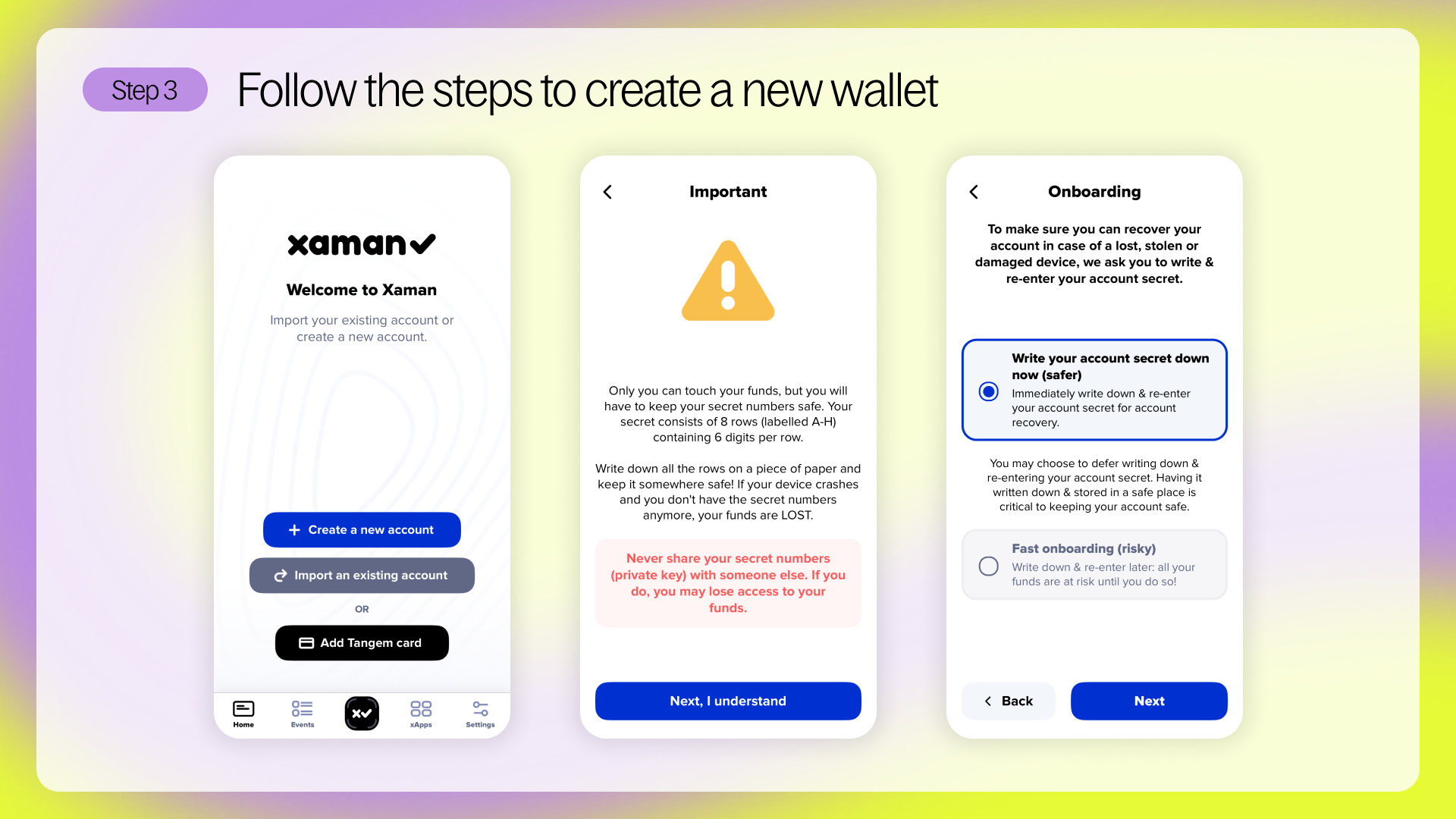 You’ll be presented with your wallet’s recovery phrase. Xaman uses a system called secret numbers to secure wallets - this consists of 8 rows of 6 digits each. These numbers are your private key, and they’re the only way to recover your wallet if you lose access. Write this phrase down and store it offline **in a secure place. Never save it on your phone, browser, or cloud storage. Anyone with this phrase can access your wallet.