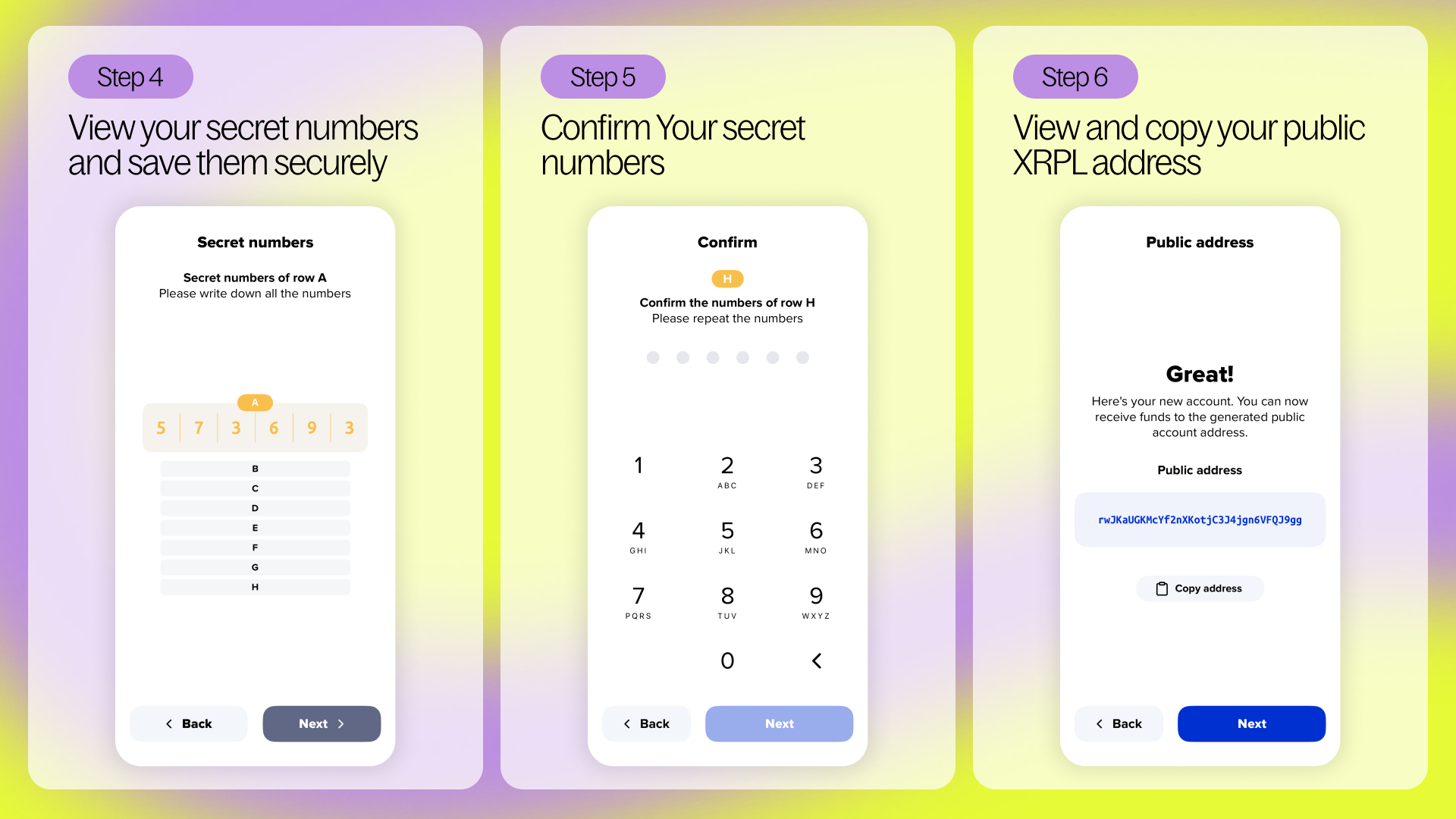 Once the wallet is created, your public XRPL address will be shown. This is like your wallet’s account number - it’s safe to share with others so they can send you XRP or tokens, but it can’t be used to access your wallet.