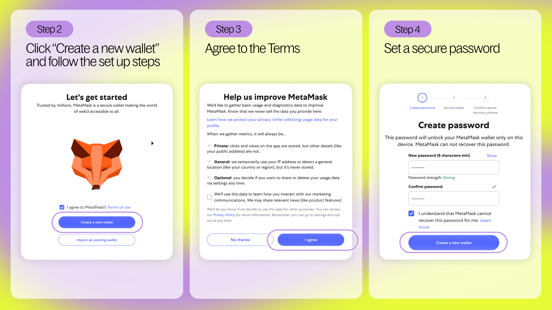 After selecting "Create a Wallet", you’ll be asked to agree to MetaMask’s terms of use. Read and accept to continue.