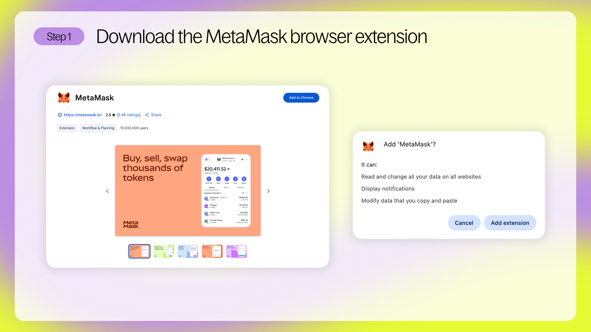 Go to metamask.io/download and add the extension to your browser (Chrome, Brave, Firefox, or Edge supported).
