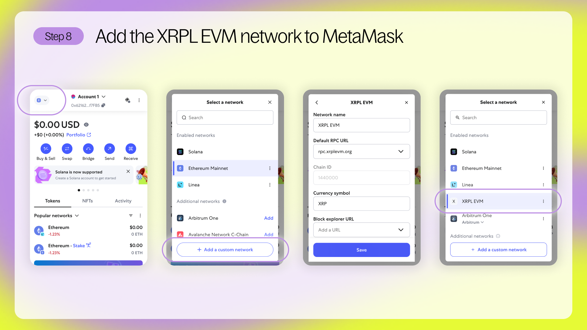 Unlike XRPL wallets like Xaman or Crossmark, MetaMask is built for EVM chains. You’ll need it to explore apps and tools on XRPL EVM, and it also works seamlessly with networks like Ethereum, Arbitrum, Polygon, and Base.