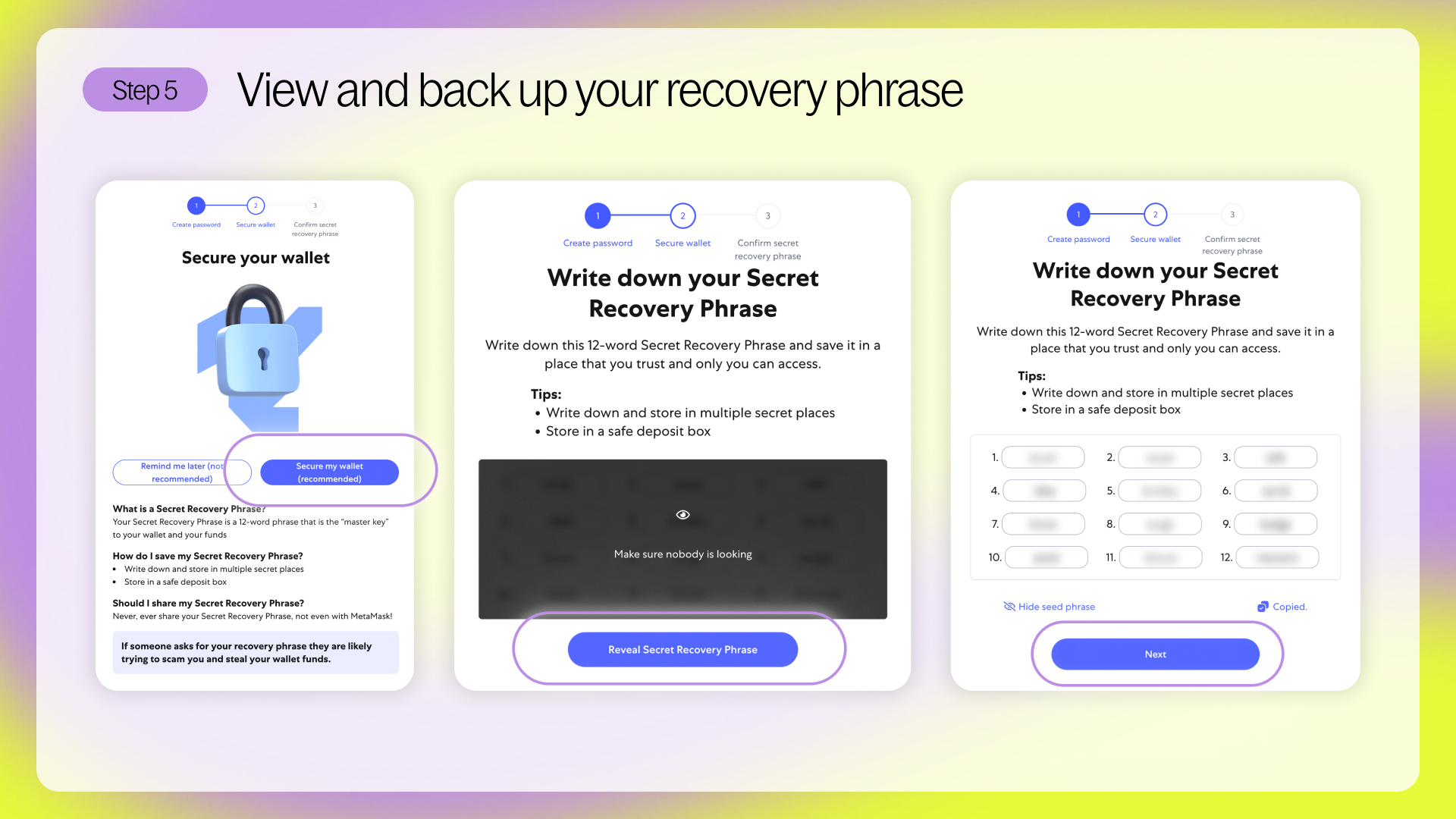 - Write down your recovery phrase and store it offline - never in your phone, browser, or cloud.