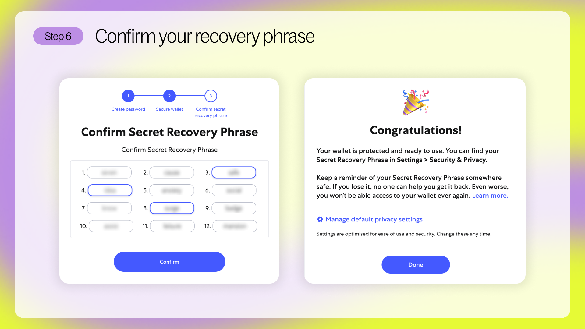 You’ll be asked to re-enter your phrase to confirm that you’ve backed it up correctly. This is a critical step - don’t skip it or rush through it.