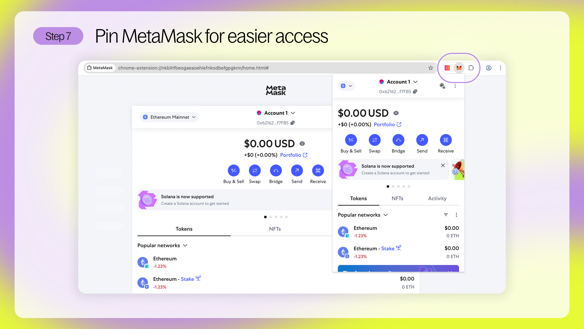 In your browser’s extensions area (usually a puzzle icon), click the MetaMask pin icon so you can always see the fox logo in your toolbar.