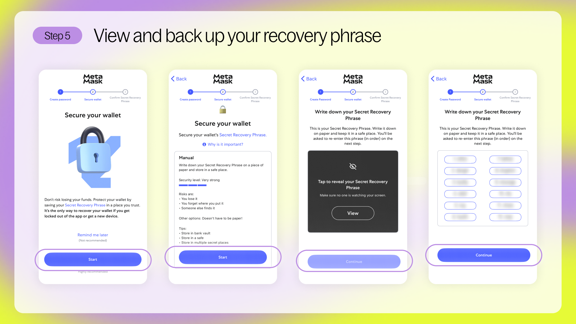 - Write down your recovery phrase and store it offline - never in your phone, browser, or cloud.