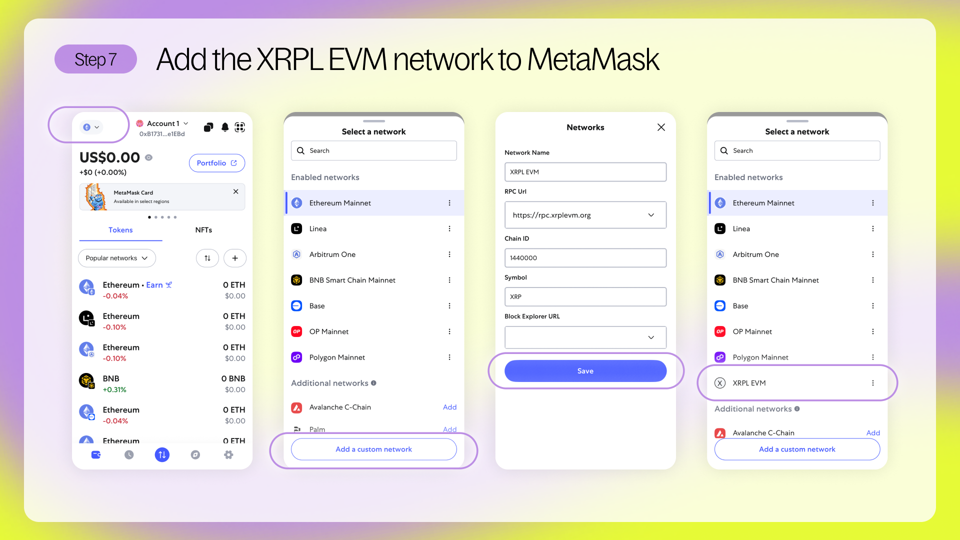 MetaMask is compatible with all EVM chains, but it won’t automatically include XRPL EVM. You’ll need to add it manually before you can use the network.