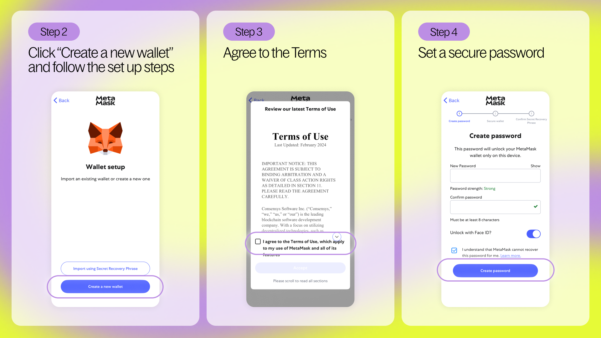 Now it’s time to secure access to the app on your device. Choose a password that’s hard to guess but easy for you to remember. This will protect your MetaMask wallet locally on your phone.