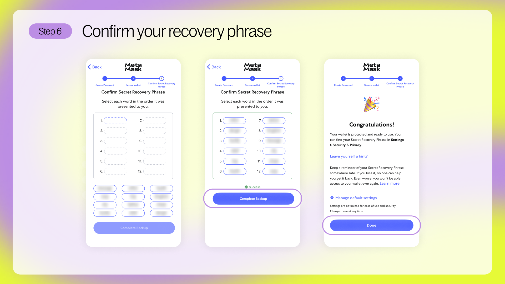 To make sure you’ve saved your recovery phrase correctly, MetaMask will ask you to re-enter it in the correct order. This step is essential - take your time and make sure it matches exactly.