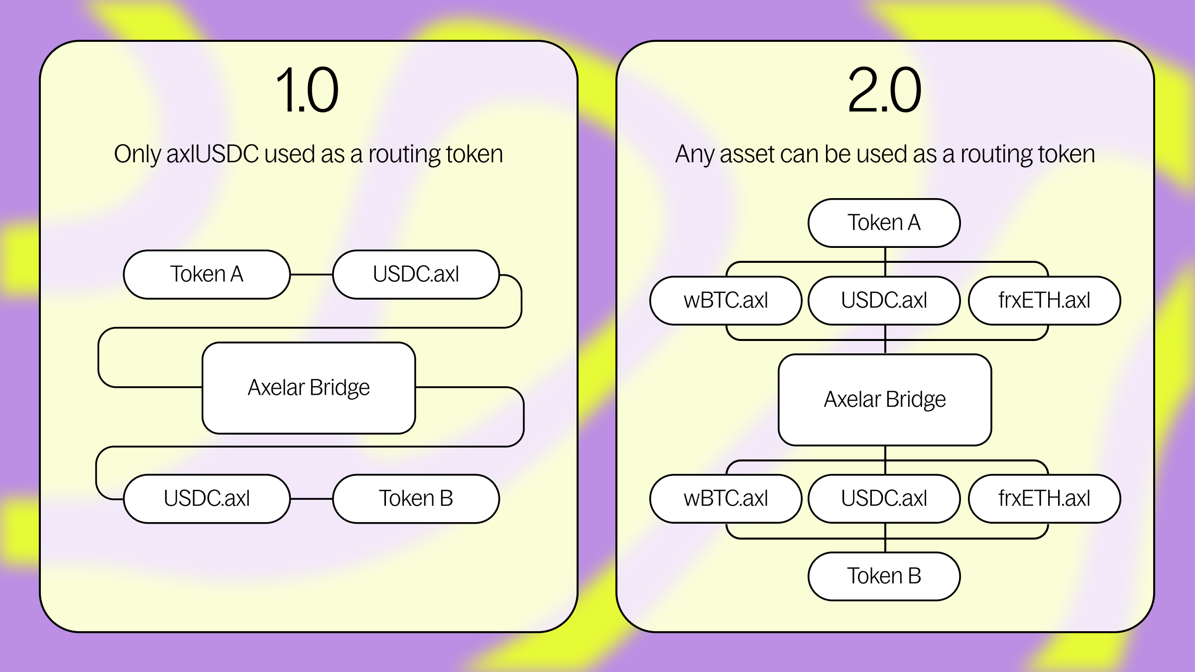 At the heart of the new system is a graph-based architecture that allows for identifying the optimal routes for making cross-chain swaps, resulting in better prices for users. Whereas the 1.0 architecture routed all swaps through axlUSDC trading pairs, 2.0 allows for routing through any bridged asset or liquidity pool integrated by Squid.