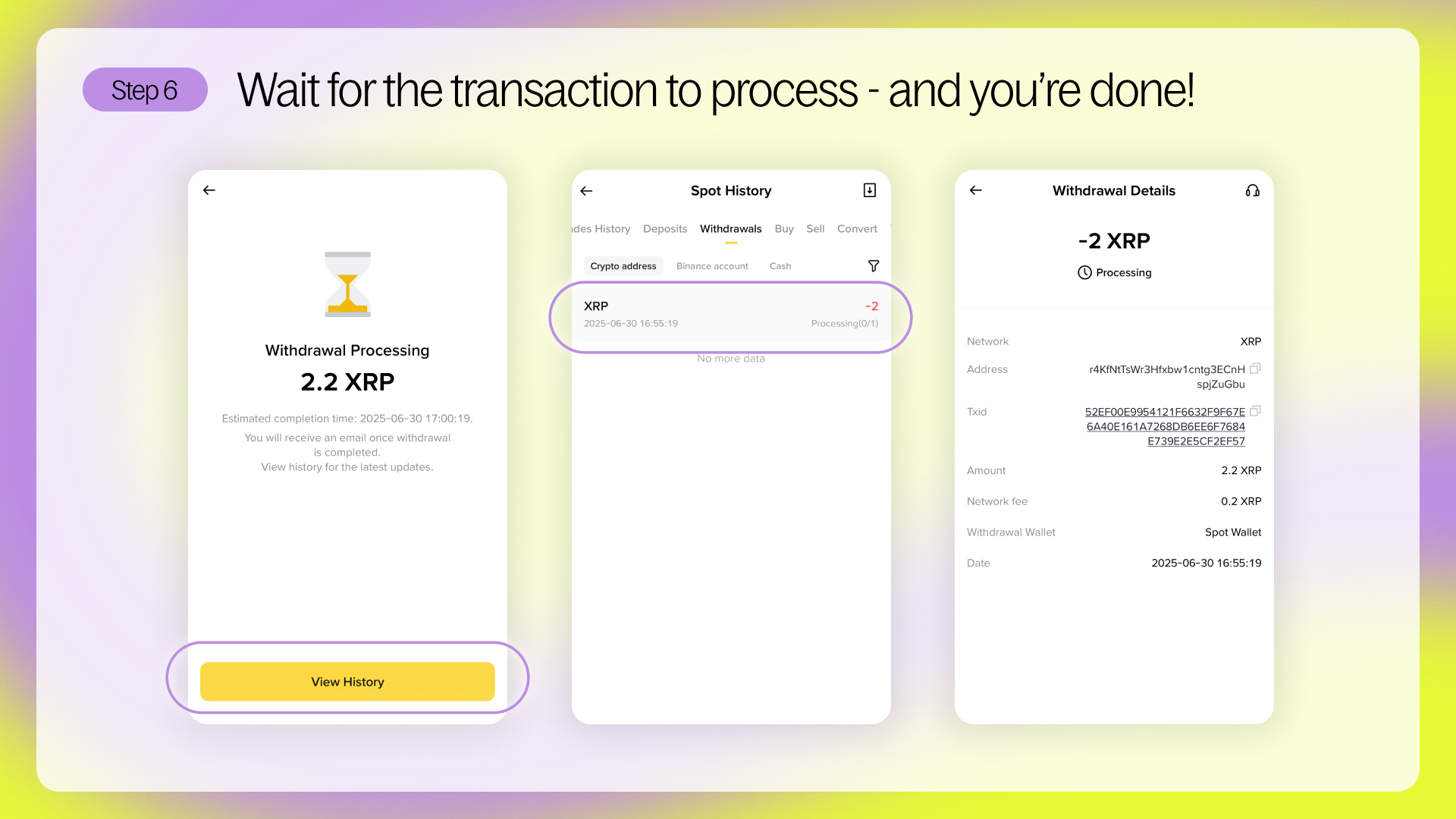 Step 6: Once the transfer is complete, your XRP will appear in your wallet! You can find the transaction receipt in Binance’s Spot History section.