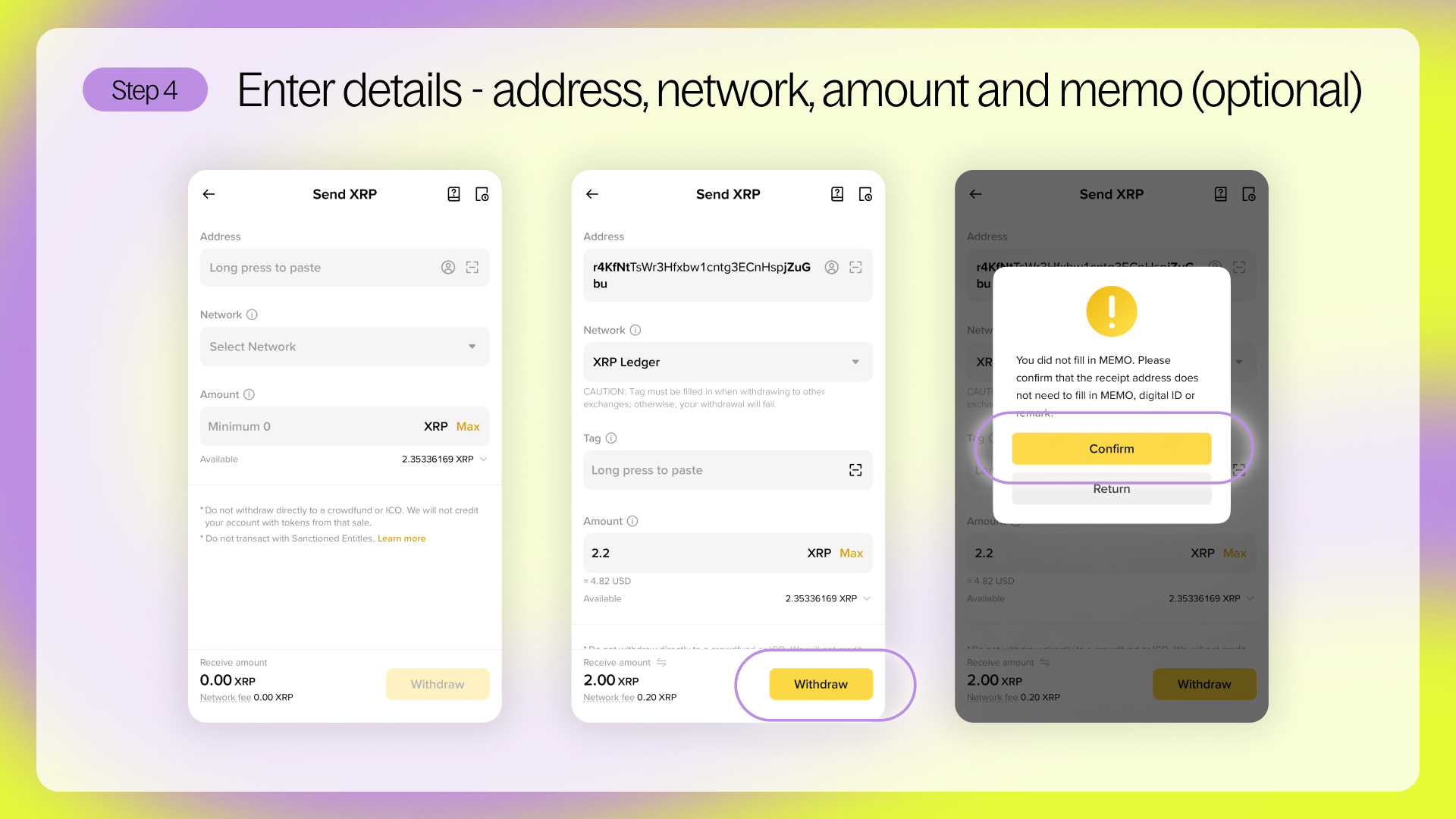 You’ll also see a field for a Tag (also called a memo). This is optional depending on where you’re sending the XRP. If you’re sending to a self-custody wallet like Xaman, you can leave the tag field blank.